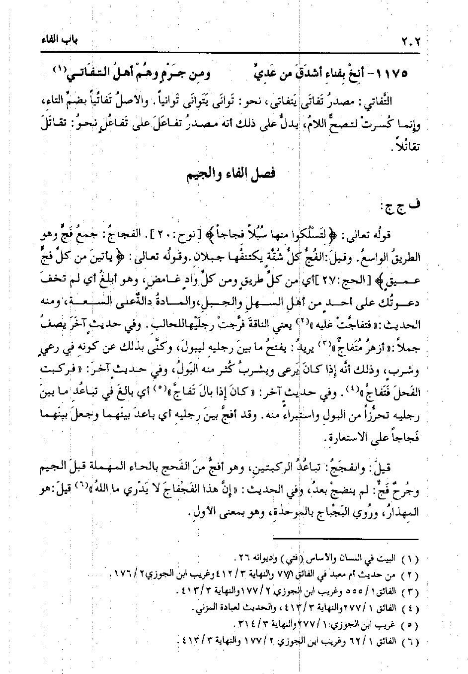 قوله تعالى:} لتسلكوا منها سبلًا فجاجًا {] نوح:20 [. الفجاج: جمع فج وهو الطريق الواسع. وقيل: الفج كل شقة يكتنفها جبلان. وقوله تعالى:} يأتين من كل فج عميق {] الحج:27 [أي من كل طريق ومن كل واد غامض، وهو أبلغ أي لم تخف دعوتك على أحد من أهل السهل والجبل، والمادة دالة على السعة، ومنه الحديث: "فتفاجت عليه يعني الناقة فرجت رجليها للحالب. وفي حديث آخر يصف جملاً: "أزهر متفاج" يريد: يفتح ما بين رجليه ليبول، وكنى بذلك عن كونه في رعي وشرب، وذلك أنه إذا كان يرعى ويشرب كثر منه البول، وفي حديث آخر: "فركبت الفحل فتفاج". وفي حديث آخر: "كان إذا بال تفاج" أي بالغ في تباعد ما بين رجليه تحرزًا من البول واستبراء منه. وقد أفج بين رجليه أي باعد بينهما وجعل بينهما فجاجًا على الاستعارة.