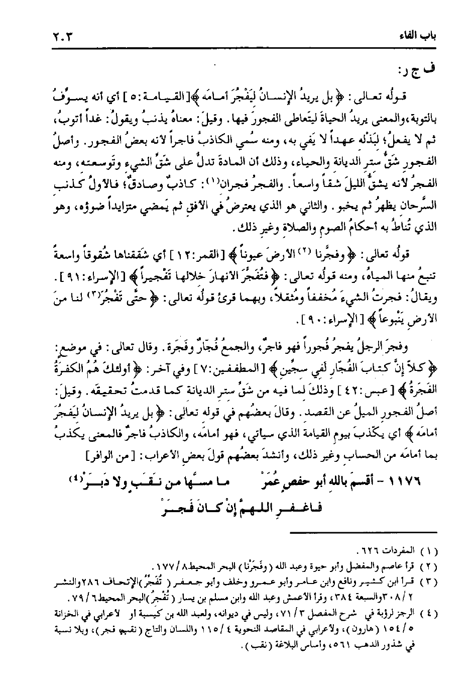 وفجر الرجل يفجر فجورًا فهو فاجر، والجمع فجار وفجرة. وقال تعالى: في موضع:} كلا إن كتاب الفجار لفي سجين {] المطففين:7 [وفي آخر:} أولئك هم الكفرة الفجرة {] عبس:42 [وذلك لما فيه من شق ستر الديانة كما قدمت تحقيقه. وقيل: أصل الفجور الميل عن القصد. وقال بعضهم في قوله تعالى:} بل يريد الإنسان ليفجر أمامه {أي يكذب بيوم القيامة الذي سيأتي، فهو أمامه، والكاذب فاجر فالمعنى يكذب بما أمامه من الحساب وغير ذلك، وأنشد بعضهم قول بعض الأعراب:] من الوافر [