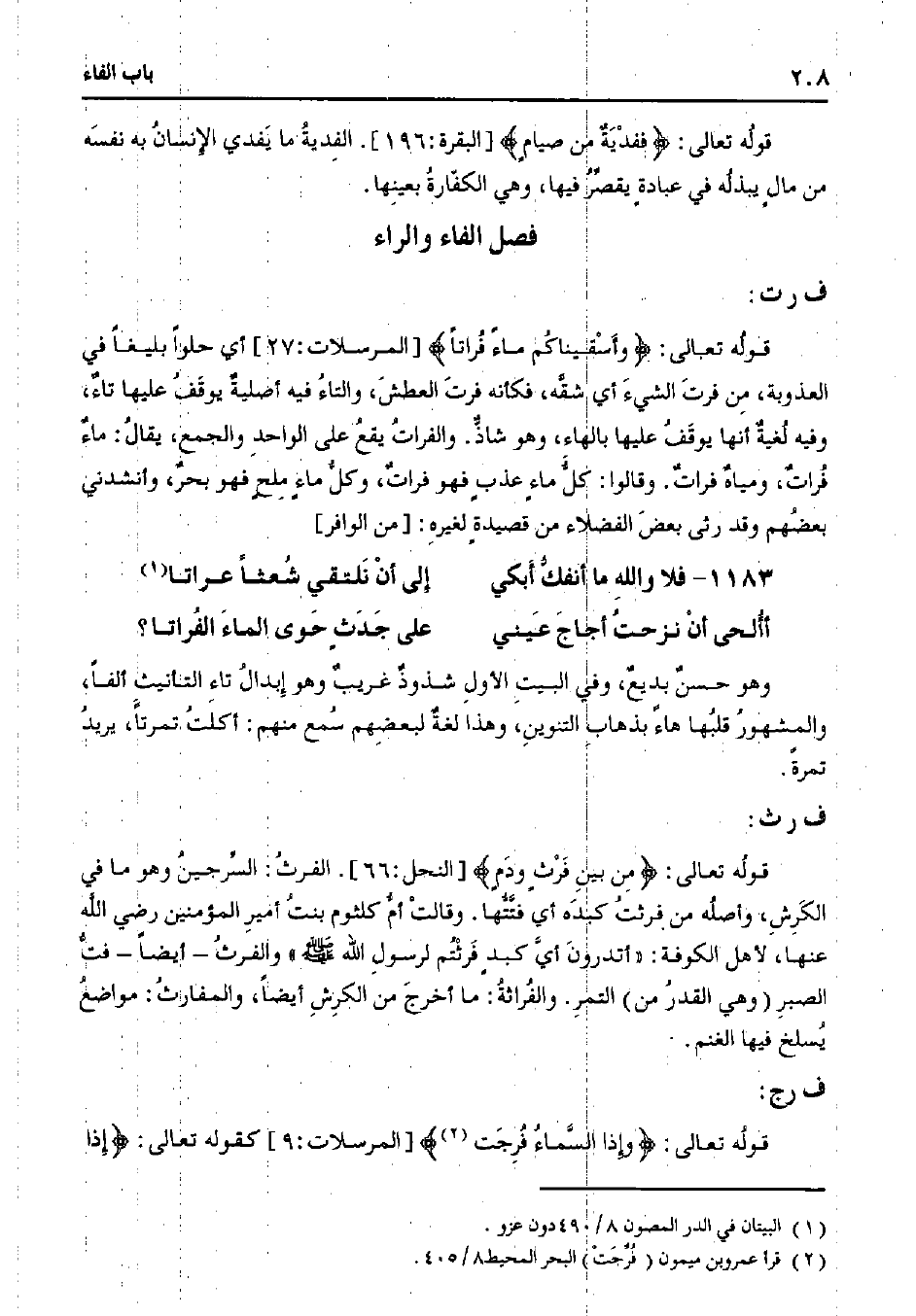 قوله تعالى:} وأسقيناكم ماء فراتًا {] المرسلات:27 [أي حلوًا بليغًا في العذوبة، من فرت الشيء أي شقة، فكأنه فرت العطش، والتاء فيه أصلية يوقف عليها تاء، وفيه لغية أنها يوقف عليها بالهاء، وهو شاذ. والفرات يقع على الواحد والجمع، يقال: ماء فرات، ومياه فرات. وقالوا: كل ماء عذب فهو فرات، وكل ماء ملح فهو بحر، وأنشدني بعضهم وقد رثي بعض الفضلاء من قصيدة لغيره:] من الوافر [