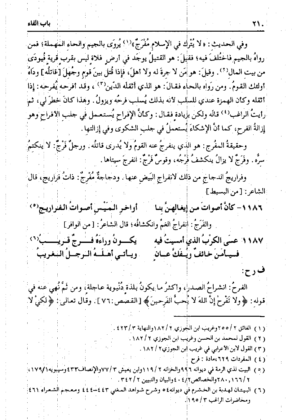 وفي الحديث: "لا يترك في الإسلام مفرج" يروى بالجيم والحاء المهملة؛ فمن رواه بالجيم فاختلف فيه؛ فقيل: هو القتيل يوجد في أرض فلاه ليس بقرب قرية فيودي من بيت المال. وقيل: هو من لا جرة له ولا أهل، فإذا قتل بين قوم وجهل] قاتله [وداه أولئك القوم. ومن رواه بالحاء فقال: هو الذي أثقله الدين، وقد أفرحه يفرحه: إذا أثقله وكأن الهمزة عندي للسلب لأنه بذلك يسلب فرحه ويزول. وهذا كان خطر لي، ثم رأيت الراغب قاله ولكن بزيادة فقال: وكأن الإفراح يستعمل في جلب الأفراح وهو إزالة الفرح، كما أن الإشكاء يستعمل في جلب الشكوى وفي إزالتها.