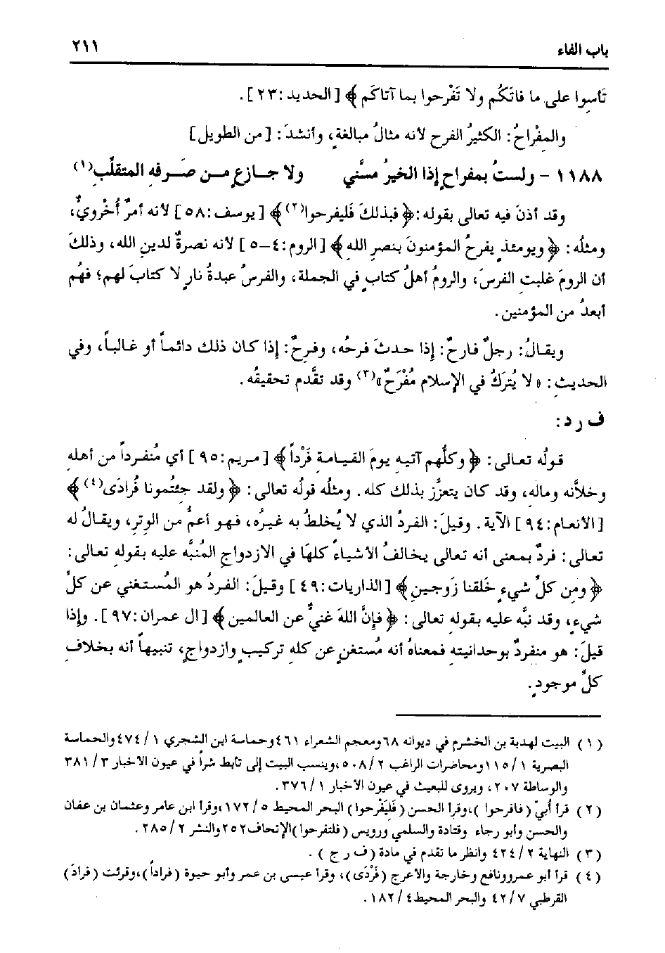 قوله تعالى:} وكلهم آتيه يوم القيامة فردًا}] مريم:95 [أي مفردًا من أهله وخلانه وماله، وقد كان يتعزز بذلك كله. ومثله قوله تعالى:} ولقد جئتمونا فرادى {] الأنعام:94 [الآية. وقيل: الفرد الذي لا يخلط به غيره، فهو أعم من الوتر، ويقال له تعالى: فرد بمعنى أنه تعالى يخالف الأشياء كلها في الازدواج المنبه عليه بقوله تعالى:} ومن كل شيء خلقنا زوجين {] الذاريات:49 [وقيل: الفرد هو المستغني عن كل شيء، وقد نبه عليه بقوله تعالى:} فإن الله غني عن العالمين {] آل عمران:97 [. وإذا قيل: هو منفرد بوحدانيته فمعناه أنه مستغن عن كله تركيب وازدواج، تنبيها أنه بخلاف كل موجود.