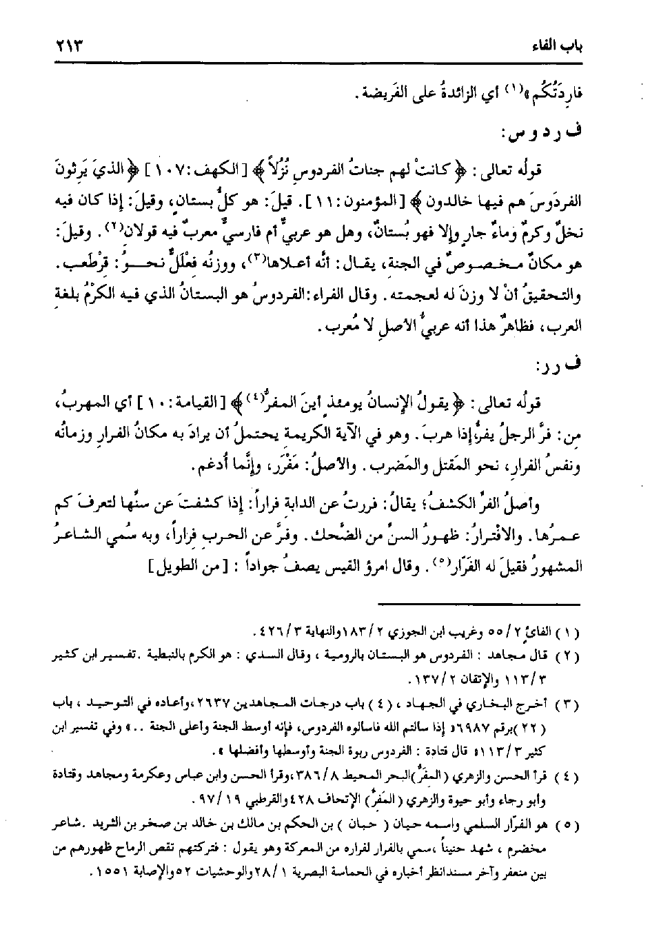 قوله تعالى:} كانت لهم جنات الفردوس نزلا {] الكهف:107 [} الذي يرثون الفردوس هم فيها خالدون {] المؤمنون:11 [. قيل: هو كل بستان، وقيل: إذا كان فيه نخل وكرم وماء جار وإلا فهو بستان، وهل هو عربي أم فارسي معرب فيه قولان. وقيل: هو مكان مخصوص في الجنة، يقال: أنه أعلاها، ووزنه فعلل نحو: قرطعب. والتحقيق أن لا وزن له لعجمته. وقال الفراء: الفردوس هو البستان الذي فيه الكرم بلغة العرب، فظاهر هذا أنه عربي الأصل لا معرب.