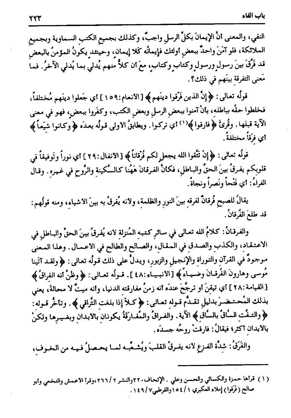 والفرقان: كلام الله تعالى في سائر كتبه المنزلة لأنه يفرق بين الحق والباطل في الاعتقاد، والكذب والصدق في المقال، والصالح والطالح في الأعمال. وهذا المعنى موجود في القرآن والتوراة والإنجيل والزبور، ويدل على ذلك قوله تعالى:} ولقد آتينا موسى وهارون الفرقان وضياء {] الأنبيا:48 [. قوله تعالى:} وظن أنه الفراق {] القيامة:28 [أي تيقن أو ترجح عنده أنه زمن مفارقته الدنيا، وأنه ميت لا محالة، يعني بذلك المحتضر بدليل تقدم قوله تعالى:} كلا إذا بلغت التراقي {. وتأخر قوله:} والتفت الساق بالساق {الآية. والفراق والمفارقة يكونان بالأبدان وبغيرها ولكن بالأبدان أكثر؛ فيقال: فارقت روحه جسده.