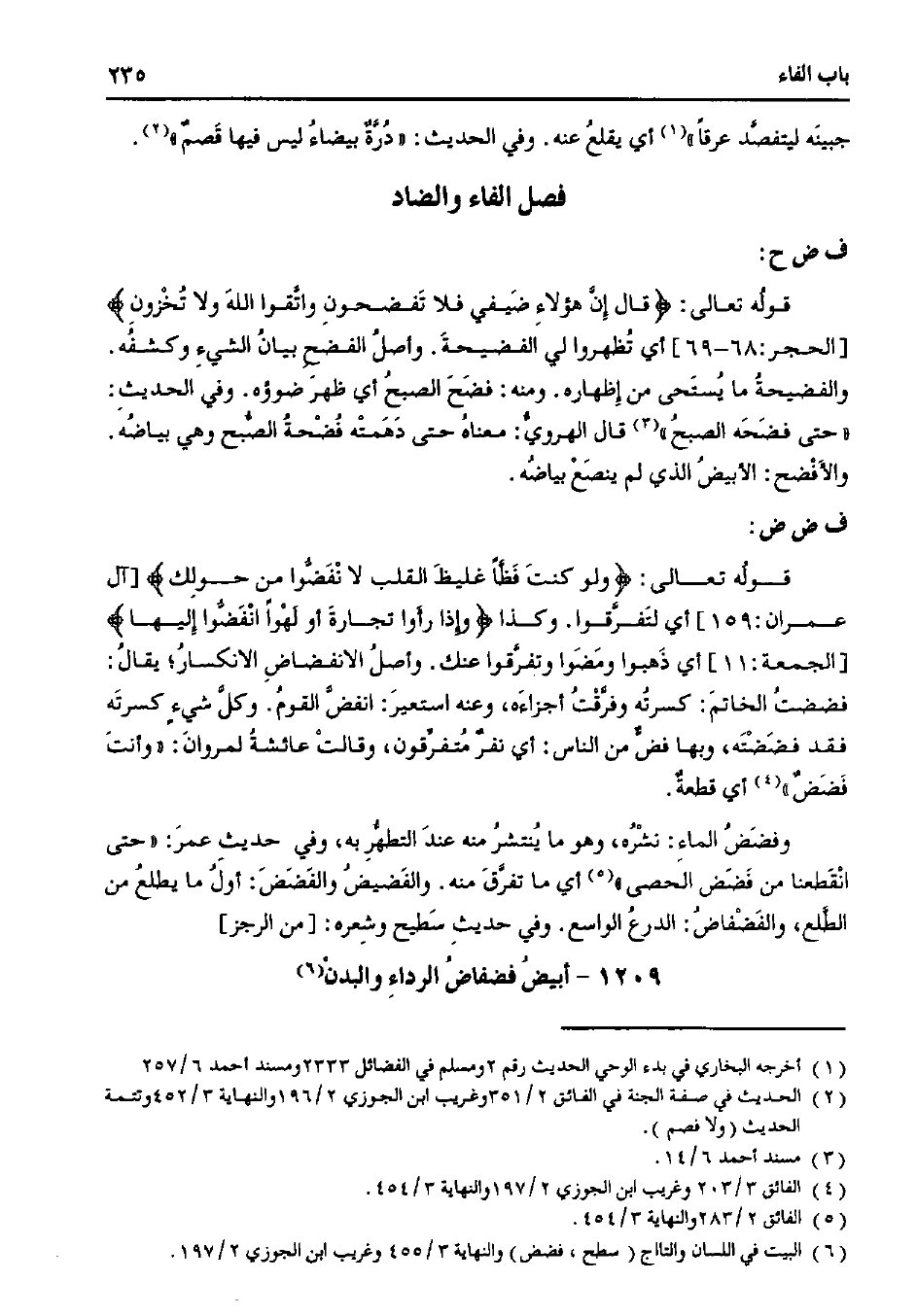 قوله تعالى: {قال إن هؤلاء ضيفي فلا تفضحون واتقوا الله ولا تخزون} [الحجر: 68 - 69] أي تظهروا لي الفضيحة. وأصل الفضح بيان الشيء وكشفه. والفضيحة ما يستحي من إظهاره. ومنه: فضح الصبح أي ظهر ضوؤه. وفي الحديث: "حتى فضحه الصبح" قال الهروي: معناه حتى دهمته فضحه الصبح وهي بياضه. ولأفضح: الأبيض الذي لم ينصع بياضه.