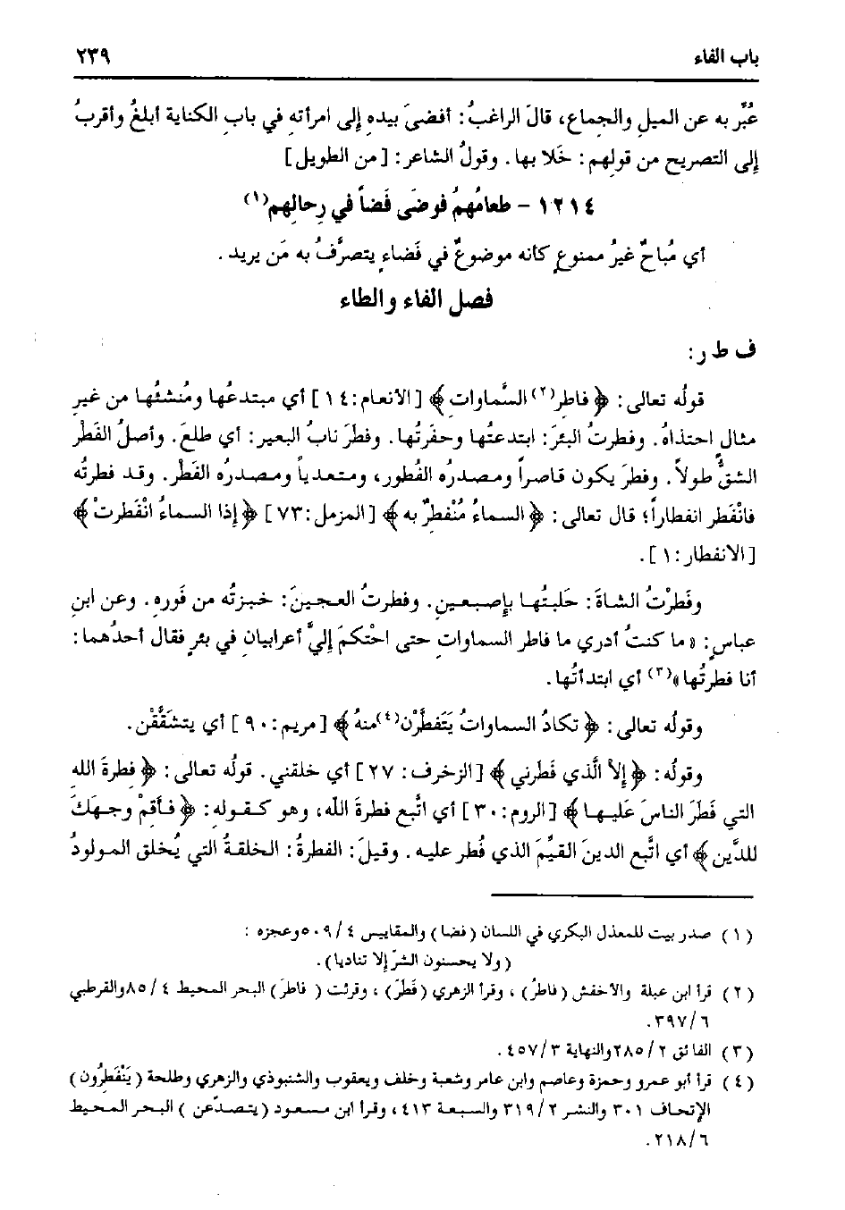 قوله تعالى: {فاطر السماوات} [الأنعام:14] أي مبتدعها ومنشئها من غير مثال احتذاه. وفطرت البئر: ابتدعتها وحفرتها. وفطر ناب البعير: أي طلع. وأصل الفطر الشق طولًا. وفطر يكون قاصرًا ومصدره الفطور، ومتعديًا ومصدره الفطر. وقد فطرته فانفطر انفطارًا؛ قال تعالى: {السماء منفطر به} [الزمل: 73] {إذا السماء انفطرت} [الانفطار:1]