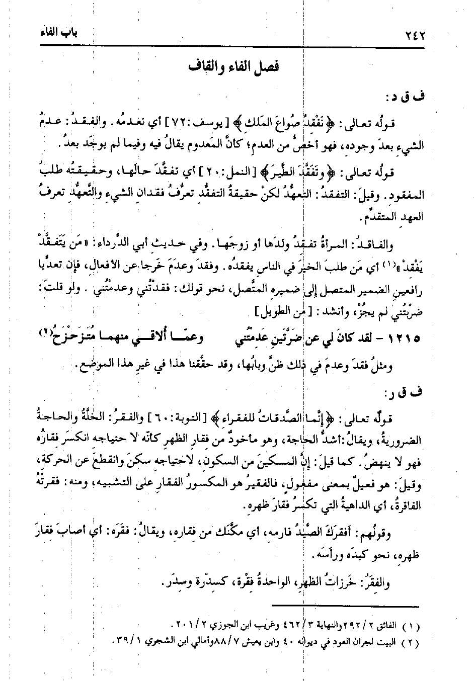 والفاقد: المرأة تفقد ولدها أو زوجها. وفي حديث أبي الدرداء: "من يتفقد يفقد" أي من طلب الخير في الناس يفقده. وفقد وعدم خرجا عن الأفعال، فإن تعديا رافعين الضمير المتصل إلى ضميره المتصل، نحو قولك: فقدتني وعدمتني. ولو قلت: ضربتني لم يجز، وأنشد: [من الطويل]