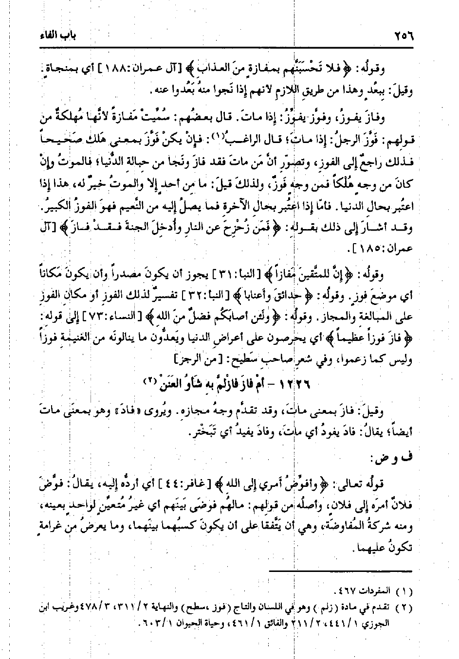 وفاز يفوز، وفوز يفوز: إذا مات. قال بعضهم: سميت مفازةً لأنها مهلكة من قولهم: فوز الرجل: إذا مات؛ قال الراغب: فإن يكن فوز بمعنى هلك صحيحًا فذلك راجع إلى الفوز، وتصور أن من مات فقد فاز ونجا من حبالة الدنيا؛ فالموت وإن كان من وجه هلكًا فمن وجه فوز، ولذلك قيل: ما من أحدٍ إلا والموت خير له، هذا إذا اعتبر بحال الدنيا. فأما إذا اعتبر بحال الآخرة فما يصل إليه من النعيم فهو الفوز الكبير. وقد أشار إلى ذلك بقوله: {فمن زحزح عن النار وأدخل الجنة فقد فاز} [آل عمران: 185].