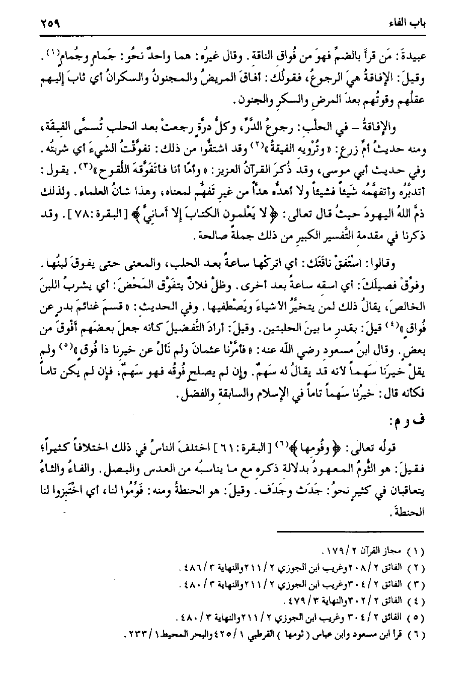 والإفاقة -في الحلب: رجوع الدر، وكل درةٍ رجعت بعد الحلب تسمى الفيقة، ومنه حديث أم زرعٍ: "وترويه الفيقة" وقد اشتقوا من ذلك: تفوقت الشيء أي شربته. وفي حديث أبي موسى، وقد ذكر القرآن العزيز: "وأما أنا فأتفوقه اللقوح". يقول: أتدبره وأفهمه شيئًا فشيئًا ولا أهده هدًا من غير تفهم لمعناه، وهذا شأن العلماء. ولذلك ذم الله اليهود حيث قال تعالى: {لا يعلمون الكتاب إلا أماني} [البقرة: 78]. وقد ذكرنا في مقدمة التفسير الكبير من ذلك جملة صالحة.
