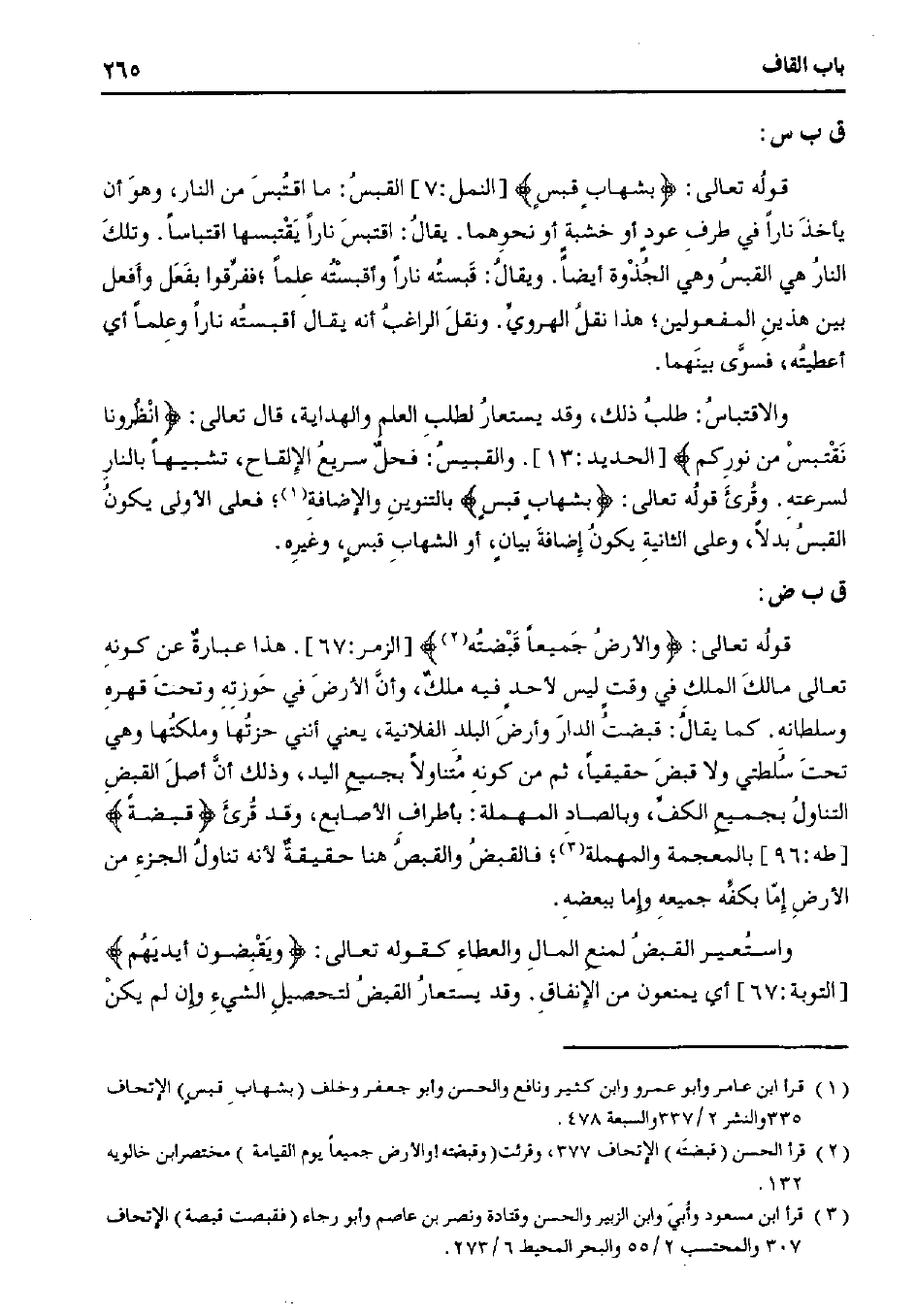 قوله تعالى: {والأرض جميعًا قبضته} [الزمر: 67]. هذا عبارة عن كونه تعالى مالك الملك في وقت ليس لأحدٍ فيه ملك، وأن الأرض في حوزته وتحت قهره وسلطانه. كما يقال: قبضت الدار وأرض البلد الفلانية، يعني أنني حزتها وملكتها وهي تحت سلطتي ولا قبض حقيقيًا، ثم من كونه متناولاً بجميع اليد، وذلك أن أصل القبص التناول بجميع الكف، وبالصاد المهملة: بأطراف الأصابع، وقد قرئ {قبضةً} [طه: 96] بالمعجمة والمهملة؛ فالقبض والقبض هنا حقيقة لأنه تناول الجزء من الأرض إما بكفه جميعه وإما ببعضه.