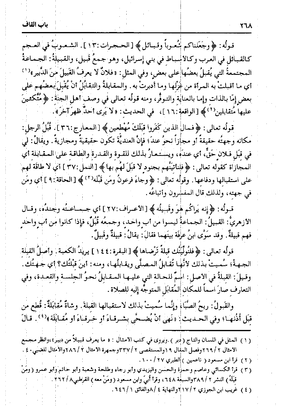 قوله: {وجعلناكم شعوبًا وقبائل} [الحجرات: 13]. الشعوب في العجم كالقبائل في العرب وكالأسباط في نبي إسرائيل، وهو جمع قبيل، والقبيلة: الجماعة المجتمعة التي يقبل بعضها على بعضٍ، وفي المثل: "فلان لا يعرف القبيل من الدبير" أي ما أقبلت به المرأة من غزلها وما أدبرت به. والمقابلة والتقابل أن يقبل بعضهم على بعض إما بالذات وإما بالعناية والتوفر، ومنه قوله تعالى في وصف أهل الجنة: {متكئين عليها متقابلين} [الواقعة: 16]، في الحديث: "لا يرى أحد ظهر آخر".