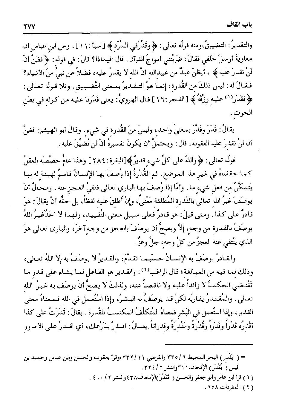 قوله تعالى: {والله على كل شيء قدير} [البقرة: 284] وهذا عام خصصه العقل كما حققناه في غير هذا الموضع. ثم القدرة إذا وصف بها الإنسان فاسم لهيئة له بها يتمكن من فعل شيء ما. وأا إذا وصف بها الباري تعالى فنفي العجز عنه. ومحال أن يوصف غير الله تعالى بالقدرة المطلقة معنى، وإن أطلق عليه لفظًا، بل حقه أن يقال: هو قادر على كذا. ومتى قيل: هو قادر فعلى سبيل معنى التقييد، ولهذا لا أحد غير الله يوصف بالقدرة من وجه، إلا ويصح أن يوصف بالعجز من وجه آخر، والباري تعالى هو الذي ينتفي عنه العجز من كل وجه، جل وعز.