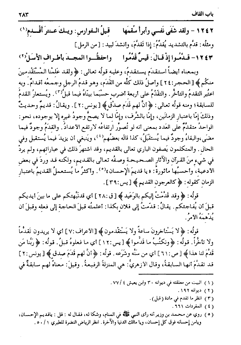 وبمعناه أيضًا استقدم يستقدم، وعليه قوله تعالى: {ولقد علمنا المستقدمين منكم} [الحجر: 24] وأصل ذلك كله من القدم، وهو قدم الرجل وجمعه أقدام. وبه اعتبر التقدم والتأخر. والتقدم على أربعة أضرب حسبما بيناه فيما قبل. ويستعار القدم للسابقة؛ ومنه قوله تعالى: {أن لهم قدم صدق} [يونس: 2]. ويقال: قديم وحديث وذلك إما باعتبار الزمانين، وإما بالشرف، وإما لما لا يصح وجود غيره إلا بوجوده، نحو: الواحد متقدم على العدد بمعنى أنه لو تصور ارتفاعه لارتفع الأعداد. والقدم وجود فيما مضى، والبقاء وجود فيما يستقبل، كذا قاله بعضهم. وينبغي أن يزيد فيما يستقبل وفي الحال. والمتكلمون يصفون الباري تعالى بالقديم، وقد اشتهر ذلك في عباراتهم، ولم يرد في شيء من القرآن والآثار الصحيحة وصفه تعالى بالقديم، ولكنه قد ورد في بعض الأدعية، وأحسبها مأثورة: ((يا قديم الإحسان)). وأكثر ما يستعمل القديم باعتبار الزمان كقوله: {كالعرجون القديم} [يس: 39].
