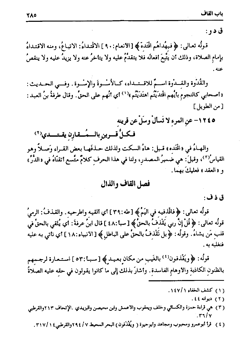 قوله تعالى: {فاقذفيه في اليم} [طه:39] أي ألقيه واطرحيه. والقذف: الرمي قوله تعالى: {قل إن ربي يقذف بالحق} [سبأ:48] قال ابن عرفة: أي يلقي بالحق في قلب من يشاء. وقوله: {بل نقذف بالحق على الباطل} [الأنبياء:18] أي نأتي به عليه فنغلبه به.