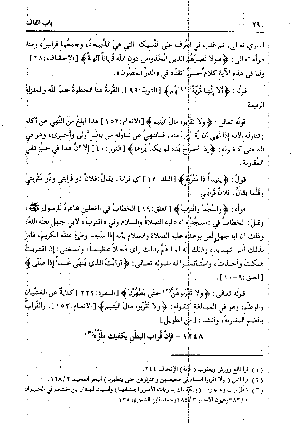 قوله تعالى: {ولا تقربوهن حتى يطهرن} [البقرة:222] كناية عن الغشيان والوطء، وهو في المبالغة كقوله: {ولا تقربوا مال اليتيم} [الأنعام:152]. والقراب بالضم المقاربة، وأنشد: [من الطويل]