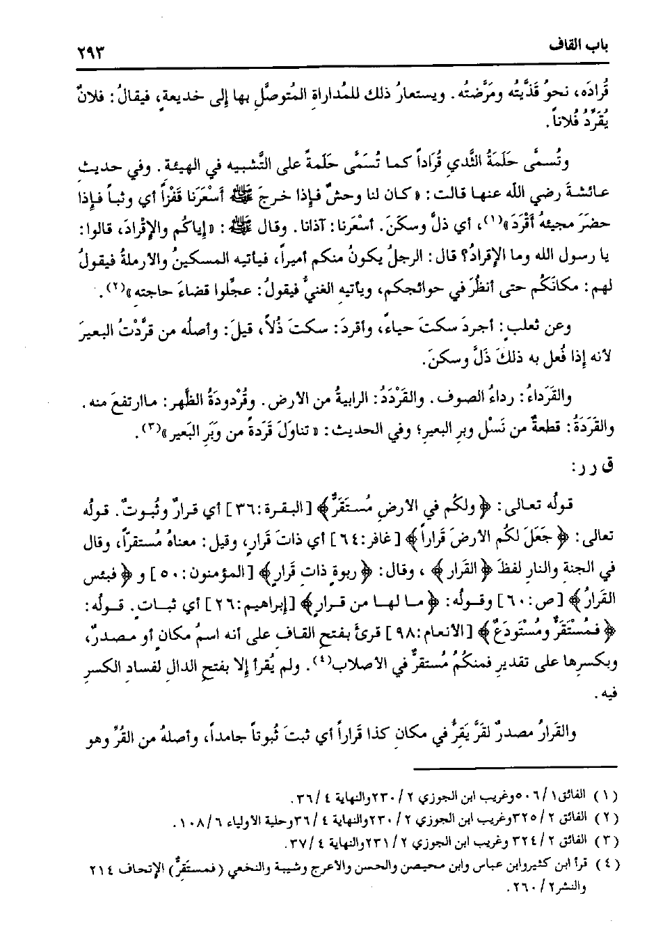 قوله تعالي: {ولكم في الأرض مستقرٌ} [البقرة: 36] أي قرارٌ وثبوتٌ. قوله تعالي: {جعل لكم الأرض قرارًا} [غافر: 64] أي ذات قرارٍ، وقيل: معناه مستقرًا، وقال في الجنة والنار لفظ {القرار}، وقال: {ربوةٍ ذات قرارٍ} [المؤمنون: 50] و {فبئس القرار} [ص: 60] وقوله: {ما لها من قرار} [إبراهيم: 26] أي ثباتٍ. قوله: {فمستقرٌ ومستودعٌ} [الأنعام: 98] قرئ بفتح القاف علي أنه اسم مكانٍ أو مصدرٌ، وبكسرها علي تقدير فمنكم مستقر في الأصلاب. ولم يقرأ إلا بفتح الدال لفساد الكسر فيه.