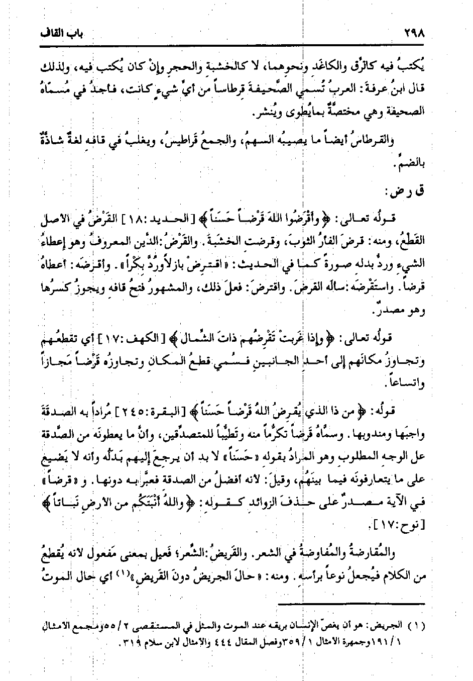 قوله تعالي: {وأقرضوا الله قرضًا حسنًا} [الحديد: 18] القرض في الأصل القطع، ومنه: قرض الفأر الثوب، وقرضت الخشبة. والقرض: الدين المعروف وهو إعطاء الشيء ورد بدله صورةٍ كما في الحديث: ((اقترض بازلًا ورد باكرًا)). وأقرضه: أعطاه قرضًا. واستقرضه: سأله القرض. واقترض: فعل ذلك، والمشهور فتح قافه ويجوز كسرها وهو مصدرٌ.