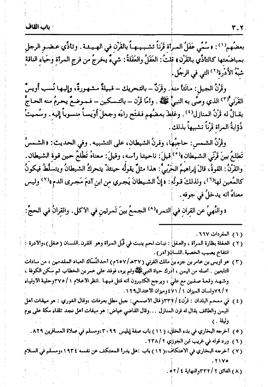 وقرن الجبل: ما نتأ منه. وقرن -بالتحريك- قبيلة مشهورة، وإليها نسب أويس القرني الذي وصى به النبي صلى الله عليه وسلم. وأما قرن -بالتسكين- فموضع يحرم منه الحاج يقال له قرن المنازل. وغلط بعضهم ففتح راءه وجعل أويسا منسوبا إليه. وسميت ذؤابة المرأة قرنا تشبيها بذلك.