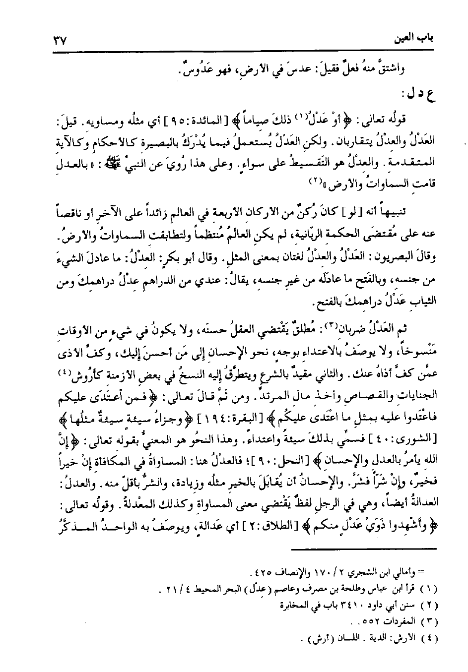 ثم العدل ضربان: مطلق يقتضي العقل حسنه، ولا يكون في شيء من الأوقات منسوخًا، ولا يوصف بالاعتداء بوجهٍ، نحو الإحسان إلى من أحسن إليك، وكف الأذى عمن كف أذاه عنك. والثاني مقيد بالشرع ويتطرق إليه النسخ في بعض الأزمنة كأروش الجنايات والقصاص وأخذ مال المرتد. ومن ثم قال تعالى:} فمن اعتدى عليكم فاعتدوا عليه بمثل ما اعتدى عليكم {[البقرة: 194]} وجزاء سيئة سيئة مثلها {[الشورى: 40] فسمي بذلك سيئًة واعتداًء. وهذا النحو هو المعنى بقوله تعالى:} إن الله يأمر بالعدل والإحسان {[النحل: 90]؛ فالعدل هنا: المساواة في المكافأة إن خيرًا فخيرن وإن شرا فشر. والإحسان أن يقابل بالخير مثله وزيادة، والشر بأقل منه. والعدل: العدالة أيضًا، وهي في الرجل لفظ يقتضي معنى المساواة وكذلك المعدلة. وقوله تعالى:} وأشهدوا ذوي عدلٍ منكم {[الطلاق: 2] أي عدالةٍ، ويوصف به الواحد المذكر
