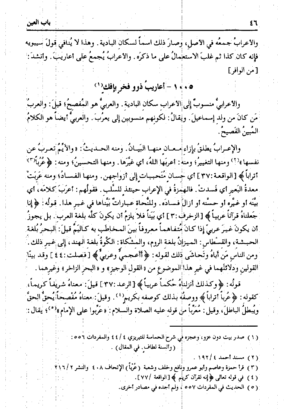 والإعراب يطلق بإزاء معانٍ منها البيان. ومنه الحديث: "والأيم تعرب عن نفسها" ومنها التغيير؛ ومنه: أعربها الله، أي غيرها. ومنها التحسين؛ ومنه:} عربًا أترابًا {[الواقعة: 37] أي حسانٍ متحبباتٍ إلى أزواجهن. ومنها الفساد؛ ومنه عربت معدة البعير أي فسدت. فالهمزة في الإعراب حينئذٍ للسلب. فقولهم: أعرب كلامه، أي بينه أو غيره أو حسنه أو أزال فساده. وللنحاة عبارات بيناها في غير هذا. قوله:} إنا جعلناه قرآنًا عربيًا {[الزخرف: 3] أي بينًا فلا يلزم أن يكون كله بلغة العرب. بل يجوز أن يكون غير عربي إذا كان متفاهمًا معروفًا بين المخاطب به كاليم قيل: البحر بلغة الحبشة، والقسطاس: الميزان بلغة الروم، والمشكاة: الكوة بلغة الهند، إلى غير ذلك. ومن الناس من أباه وتحاشى ذلك لقوله:} أأعجمي وعربي {[فصلت: 44] وقد بينا القولين ودلائلهما في غير هذا الموضوع من "القول الوجيز" و"البحر الزاخر" وغيرهما.