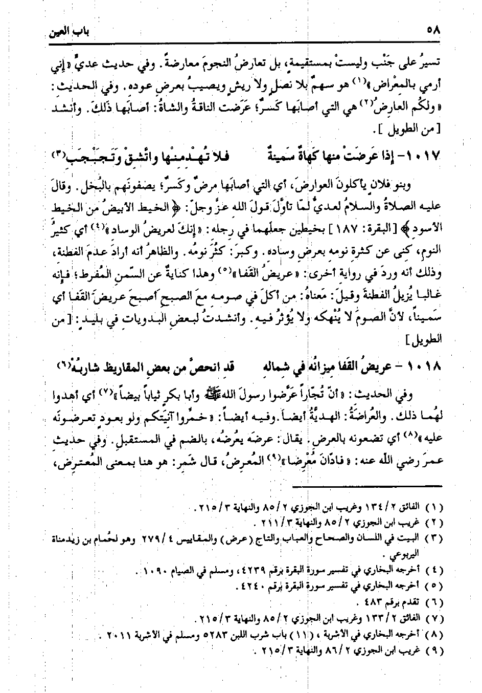 تسير على جنب وليست بمستقيمةٍ، بل تعارض النجوم معارضًة. وفي حديث عدي "إني أرمي بالمعراض" هو سهم بلا نصلٍ ولا ريشٍ ويصيب بعرض عوده. وفي الحديث: "ولكم العارض هي التي أصابها كسر؛ عرضت الناقة والشاة: أصابها ذلك. وأنشد [من الطويل].