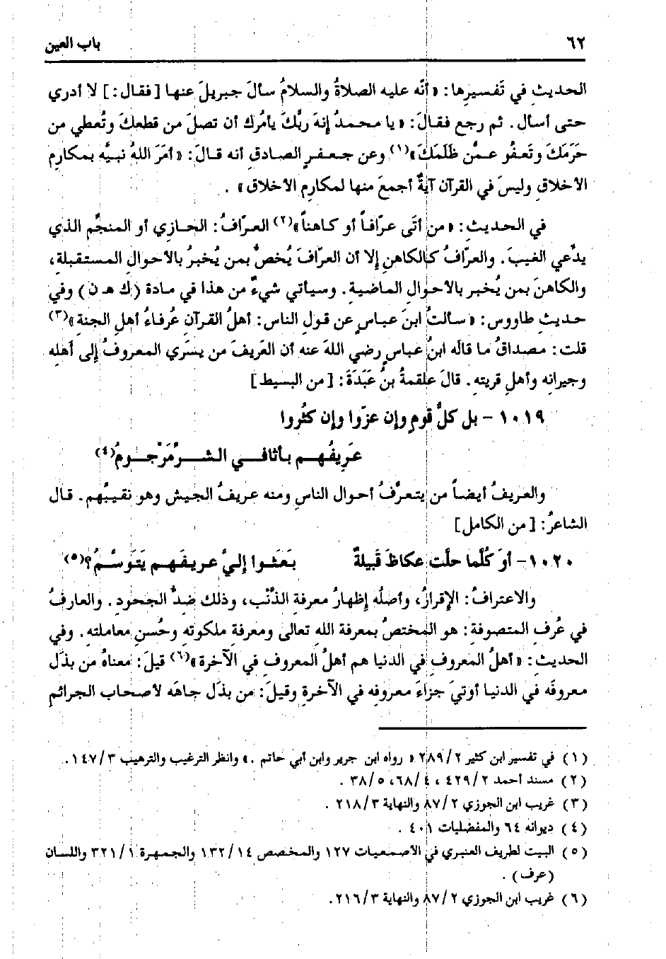 في الحديث: "من أتى عرافًا أو كاهنًا" العراف: الحازي أو المنجم الذي يدعي الغيب. والعراف كالكاهن إلا أن العراف يخص بمن يخبر بالأحوال المستقبلة، والكاهن بمن يخبر بالأحوال الماضية. وسيأتي شيء من هذا في مادة (ك هـ ن) وفي حديث طاووس: "سألت ابن عباسٍ عن قول الناس: أهل القرآن عرفاء أهل الجنة" قلت: مصداق ما قاله ابن عباسٍ رضي الله عنه أن العريف من يسري المعروف إلى أهله وجيرانه وأهل قريته. قال علقمة بن عبدة: [من البسيط]