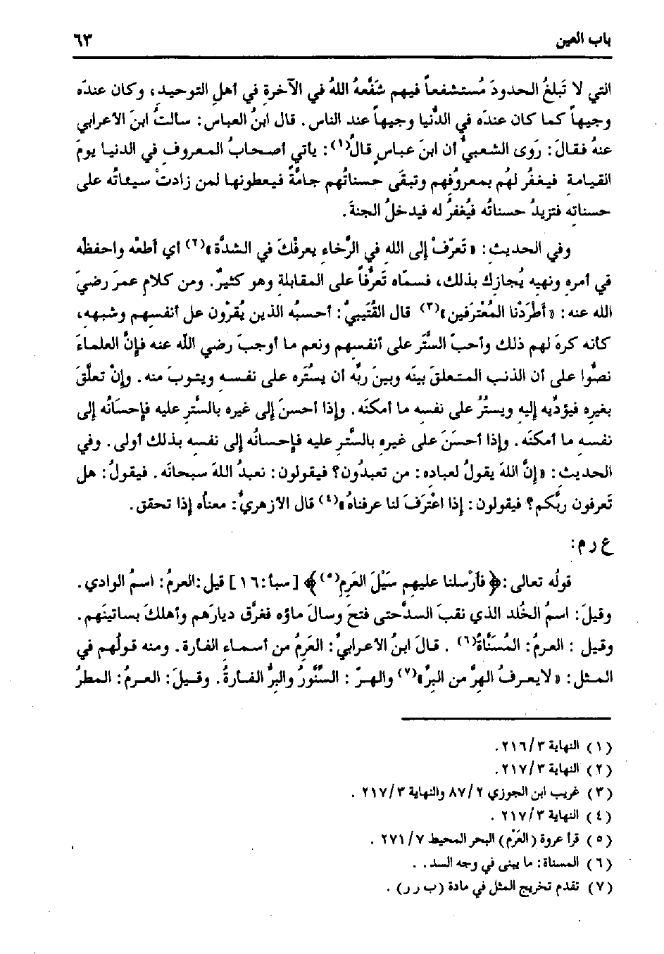التي لا تبلغ الحدود مستشفعًا فيهم شفعه الله في الآخرة في أهل التوحيد، وكان عنده وجيهًا كما كان عنده في الدنيا وجيهًا عند الناس. قال ابن العباس: سألت ابن الأعرابي عنه فقال: روى الشعبي أن ابن عباسٍ قال: يأتي أصحاب المعروف في الدنيا يوم القيامة فيغفر لهم بمعروفهم وتبقى حسناتهم جامًة فيعطونها لمن زادت سيئاته على حسناته فتزيد حسناته فيغفر له فيدخل الجنة.