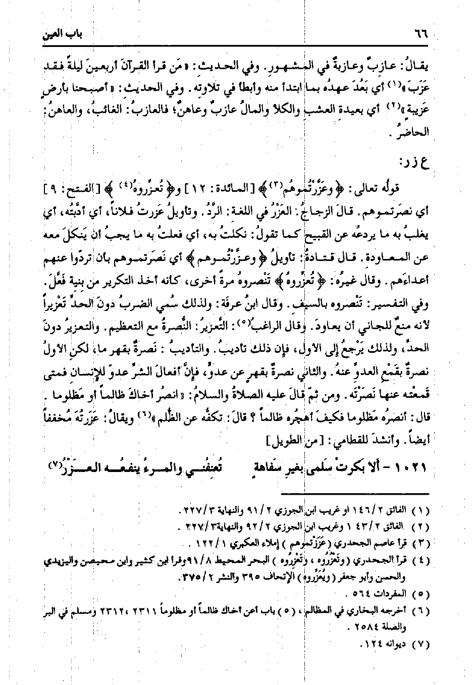 قوله تعالى:} وعزرتموهم {[المائدة: 12] و} تعزروه {[الفتح: 9] أي نصرتموهم. قال الزجاج: العزر في اللغة: الرد. وتأويل عزرت فلانًا، أي أدبته، أي يغلب به ما يردعه عن القبيح كما تقول: نكلت به، أي فعلت به ما يجب أن ينكل معه عن المعاودة. قال قتادة: تأويل} وعزرتموهم {أي نصرتموهم بأن تردوا عنهم أعداءهم. وقال غيره:} تعزروه {تنصروه مرًة أخرى، كأنه أخذ التكرير من بنية فعل. وفي التفسير: تنصروه بالسيف. وقال ابن عرفة: ولذلك سمي الضرب دون الحد تعزيرًا لأنه منع للجاني أن يعاود. وقال الراغب: التعزير: النصرة مع التعظيم. والتعزير دون الحد، ولذلك يرجع إلى الأول، فإن ذلك تأديب. والتأديب: نصرة بقهر ما، لكن الأول نصرة بقمع العدو عنه. والثاني نصرة بقهرٍ عن عدو، فإن أفعال الشر عدو للإنسان فمتى قمعته عنها نصرته. ومن ثم قال عليه الصلاة والسلام: "انصر أخاك ظالمًا أو مظلوما. قال: أنصره مظلوما فكيف أهجره ظالمًا؟ قال: تكفه عن الظلم" ويقال: عزرته مخففًا أيضًا. وأنشد للقطامي: [من الطويل]