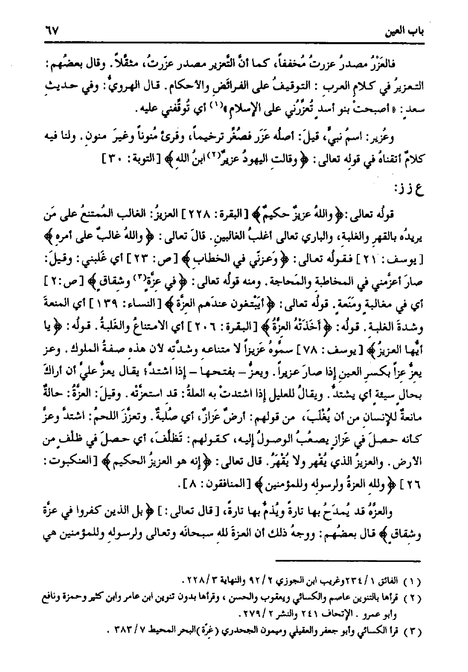 قوله تعالى:} والله عزير حكيم {[البقرة: 228] العزيز: الغالب الممتنع على من يريده بالقهر والغلبة، والباري تعالى أغلب الغالبين. قال تعالى:} والله غالب على أمره {[يوسف: 21] فقوله تعالى:} وعزني في الخطاب {[ص: 23] أي غلبني: وقيل: صار أعزمني في المخاطبة والمحاجة. ومنه قوله تعالى:} في عزةٍ وشقاقٍ {[ص: 2] أي في مغالبةٍ ومنعةٍ. قوله تعالى:} أيبتغون عندهم العزة {[النساء: 139] أي المنعة وشدة الغلبة. قوله:} أخذته العزة {[البقرة: 206] أي الامتناع والغلبة. قوله:} يا أيها العزيز {[يوسف: 78] سموه عزيزًا لامتناعه وشدته لأن هذه صفة الملوك. وعز يعز عزًا بكسر العين إذا صار عزيرًا. ويعز - بفتحها - إذا اشتد؛ يقال يعز علي أن أراك بحالٍ سيئةٍ أي يشتد. ويقال للعليل إذا اشتدت به العلة: قد استعزته. وقيل: العزة: حالة مانعة للإنسان من أن يغلب، من قولهم: أرض عزاز، أي صلبة. وتعزز اللحم: اشتد وعز كأنه حصل في عزازٍ يصعب الوصول إليه، كقولهم: تظلف، أي حصل في ظلفٍ من الأرض. والعزيز الذي يقهر ولا يقهر. قال تعالى:} إنه هو العزيز الحكيم {[العنكبوت: 26]} ولله العزة ولرسوله وللمؤمنين {[المنافقون: 8].