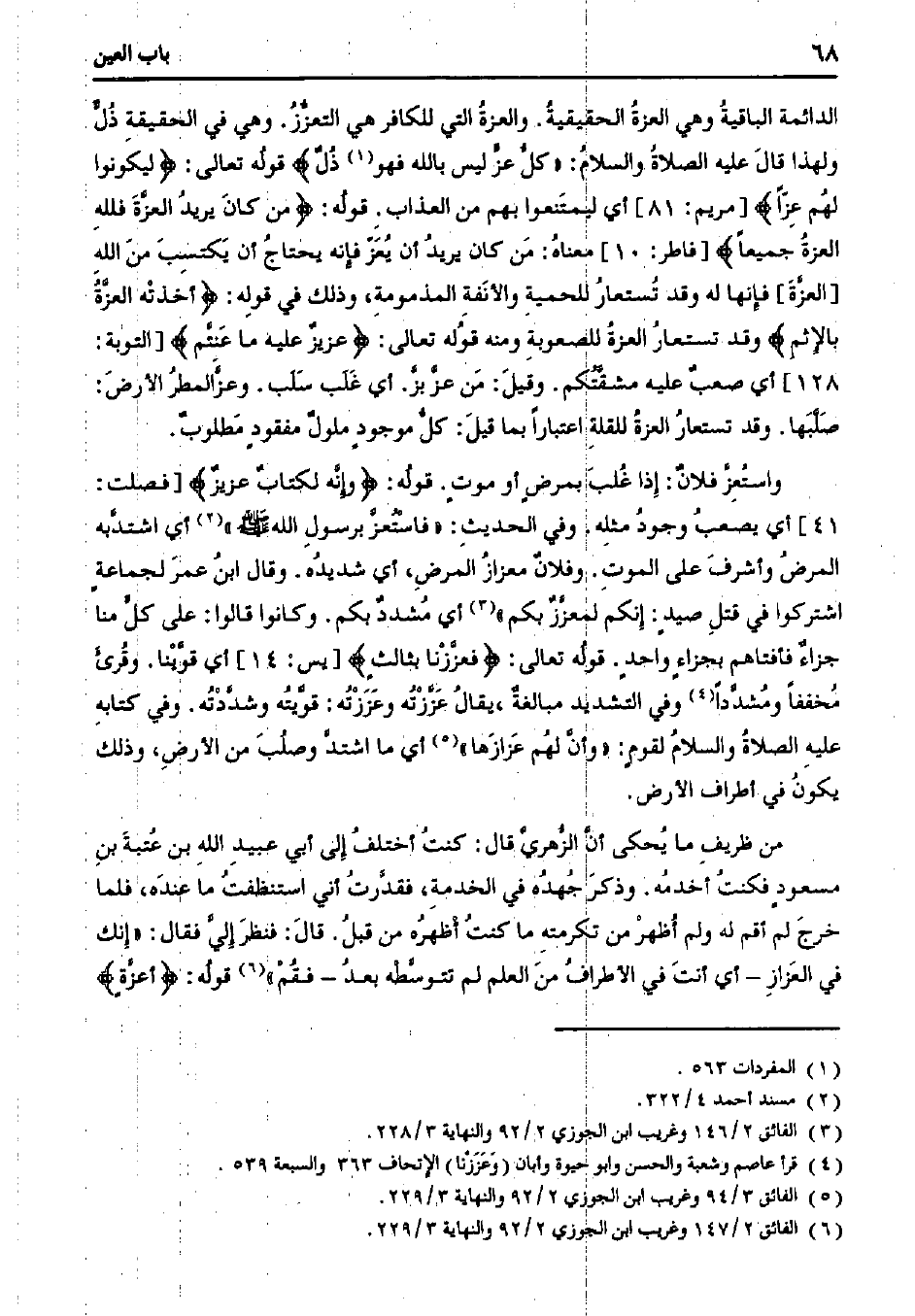 الدائمة الباقية وهي العزة الحقيقية. والعزة التي للكافر هي التعزز. وهي في الحقيقة ذل ولهذا قال عليه الصلاة والسلام: "كل عز ليس بالله فهو ذل {قوله تعالى:} ليكونوا لهم عزًا {[مريم: 81] أي ليمتنعوا بهم من العذاب. قوله:} من كان يريد العزة فلله العزة جميعًا {[فاطر: 81] معناه: من كان يريد أن يعز فإنه يحتاج أن يكتسب من الله [العزة] فإنها له وقد تستعار للحمية والأنفة المذمومة، وذلك في قوله:} أخذته العزة بالإثم {وقد تستعار العزة للصعوبة ومنه قوله تعالى:} عزيز عليه ما عنتم {[التوبة: 128] أي صعب عليه مشقتكم. وقيل: من عزيز. أي غلب سلب. وعز المطر الأرض: صلبها. وقد تستعار العزة للقلة اعتبارًا بما قيل: كل موجودٍ ملول مفقودٍ مطلوب.