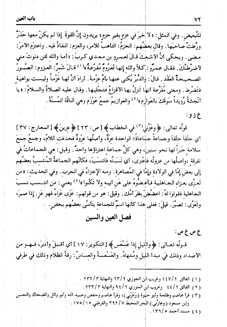 للتبعيض. وفي المثل: "لا خير في عزمٍ بغير حزمٍ" يريدون إن القوة إذا لم يكن معها حذر ورطت صاحبها. وقال بعضهم: الحزم: التأهب للأمر، والعزم: النفاذ فيه. واعتزم الأمر: مضى. ويحكى أن الأشعث قال لعمرو بن معدى كرب: "أما والله لئن دنوت مني لأضرطنك. فقال عمرو: كلا والله إنها لعزوم مفزعة" قال شمر: العزوم: الصبور الصحيحة العقد. قال: والدبر يكنى عنها بأم عزمة. أراد أن لها عزمًا وليست بواهيةٍ فتضرط. ومعنى مفزعة أنها تنزل بها الأقزاع فتجليها. وقال عليه الصلاة والسلام: "يا أنجشة رويدًا سوقك بالعوازم" والعوازيم جمع عوزم وهي الناقة المسنة.
