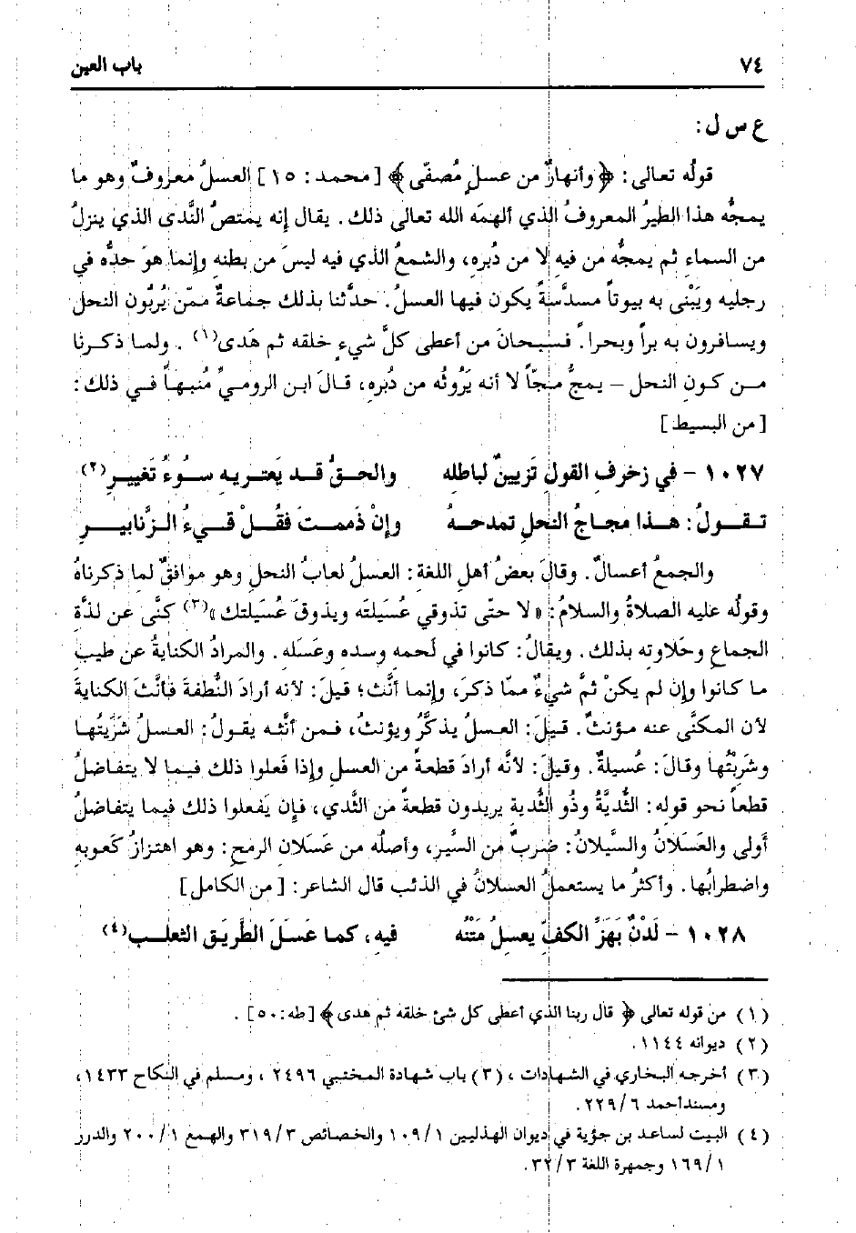 والجمع أعسال. وقال بعض أهل اللغة: العسل لعاب النحل وهو موافق لما ذكرناه وقوله عليه الصلاة والسلام: "لا حتى تذوقي عسيلته ويذوق عسيلتك" كنى عن لذة الجماع وحلاوته بذلك. ويقال: كانوا في حمله وسده وعسله. والمراد الكناية عن طيب ما كانوا وإن لم يكن ثم شيء مما ذكر، وإنما أنث؛ قيل: لأنه أراد النطفة فأنث الكناية لأن المكنى عنه مؤنث. قيل: العسل يذكر ويؤنث، فمن أنثه يقول: العسل شريتها وشربتها وقال: عسيلة. وقيل: لأنه أراد قطعًة من العسل وإذا فعلوا ذلك فيما لا يتفاضل قطعًا نحو قوله: الثدية وذو الثدية يريدون قطعًة من الثدي، فإن يفعلوا ذلك فيما يتفاضل أولى والعسلان والسيلان: ضرب من السير، وأصله من عسلان الرمح: وهو اهتزاز كعوبه واضطرابها. وأكثر ما يستعمل العسلان في الذئب قال الشاعر: [من الكامل]