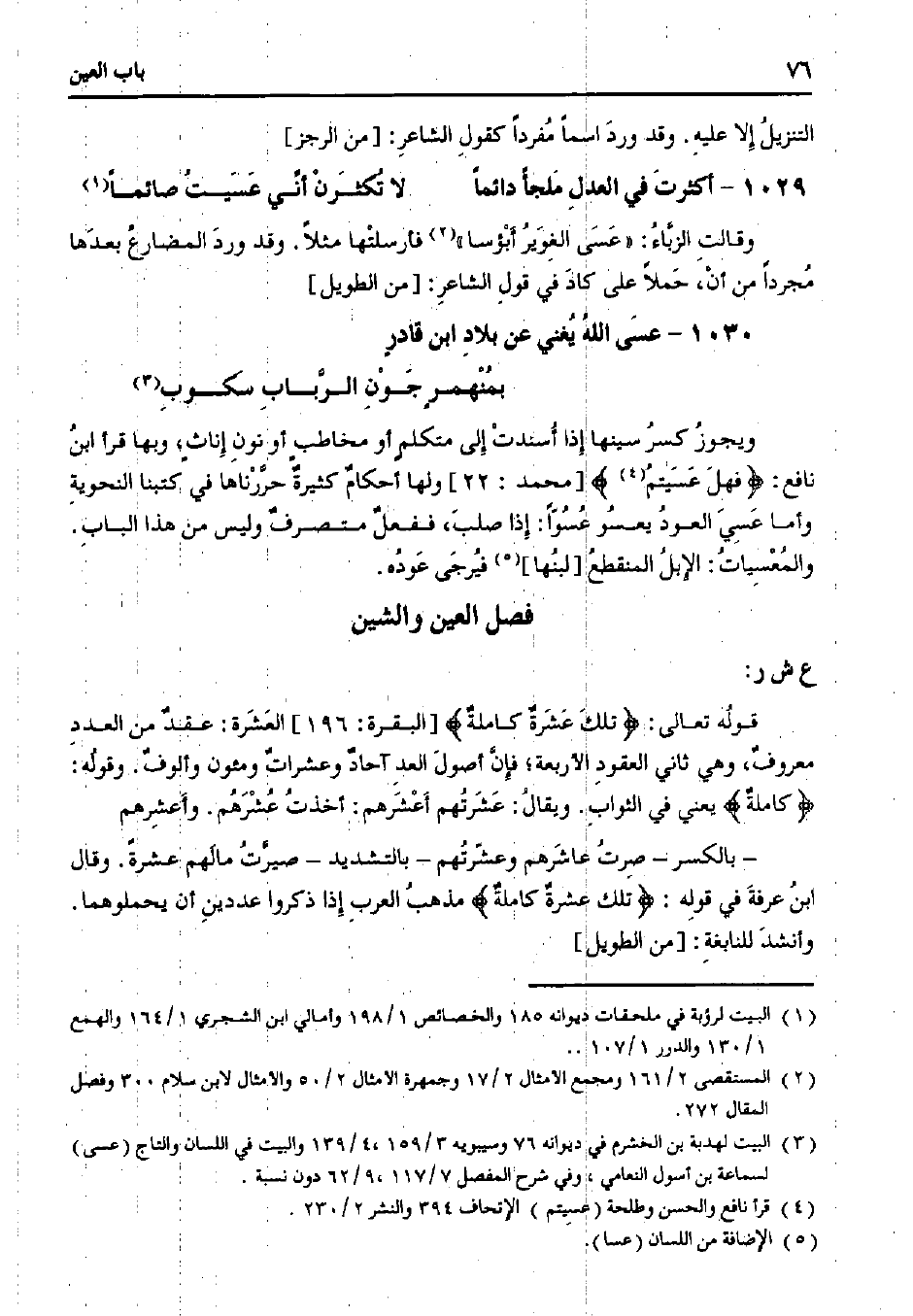 ويجوز كسر سينها إذا أسندت إلى متكلمٍ أو مخاطبٍ أو نون إناثٍ، وبها قرأ ابن نافع:} فهل عسيتم {[محمد: 22] ولها أحكام كثيرة حررناها في كتبنا النحوية وإما عسي العود يعسو عسوًا: إذا صلب، ففعل متصرف وليس من هذا الباب. والمعسيات: الإبل المنقطع [لبنها] فيرجى عوده.
