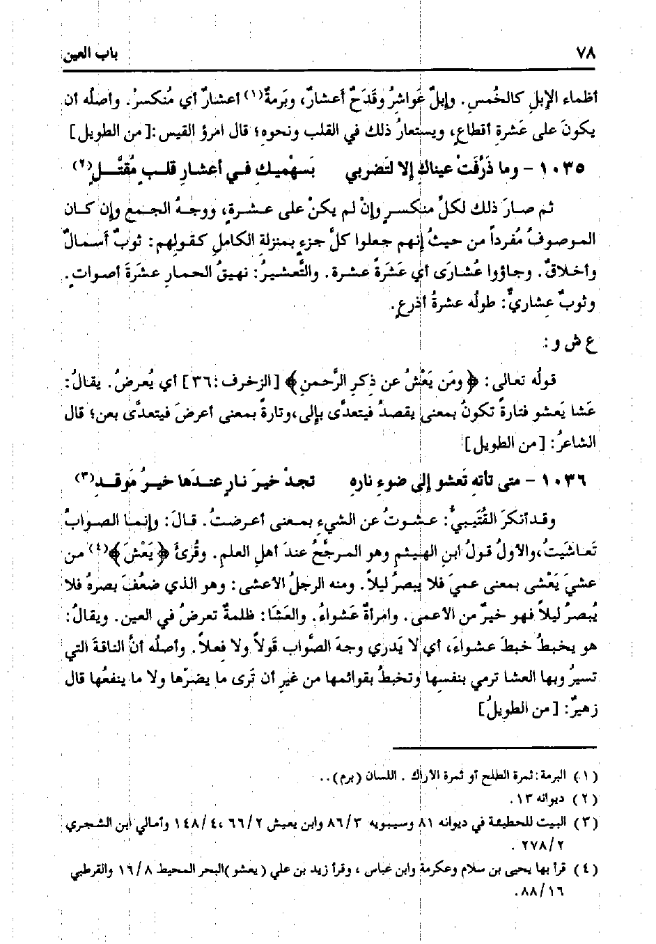 وقد أنكر القتيبي: عشوت عن الشيء بمعنى أعرضت. قال: وإنما الصواب تعاشيت، والأول قول ابن الهيثم وهو المرجح عند أهل العلم. وقرئ} يعش {من عشي يعشى بمعنى عمي فلا يبصر ليلاً. ومنه الرجل الأعشى: وهو الذي ضعف بصره فلا يبصر ليلاً فهو خير من الأعمى. وامرأة عشواء. والعشا: ظلمة تعرض في العين. ويقال: هو يخبط خبط عشواء، أي لا يدري وجه الصواب قولاً ولا فعلاً. وأصله أن الناقة التي تسير وبها العشا ترمي بنفسها وتخبط بقوائمها من غير أن ترى ما يضرها ولا ما ينفعها قال زهير: [من الطويل]
