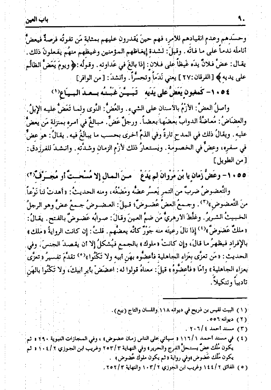 وأصل العض: الأزم بالأسنان على الشيء. والعض: النوى ولما تعض عليه الإبل. والعضاض: معاضة الدواب بعضها بعضًا. ورجل عض. مبالغ في أمره بمنزلة من يعض عليه. ويقال ذلك في المدح تارًة وفي الذم أخرى بحسب ما يبالغ فيه. يقال: هو عض في سفره، وعض في الخصومة. ويستعار ذلك لأزم الزمان وشدته. وأنشد للفرزدق: [من الطويل]
