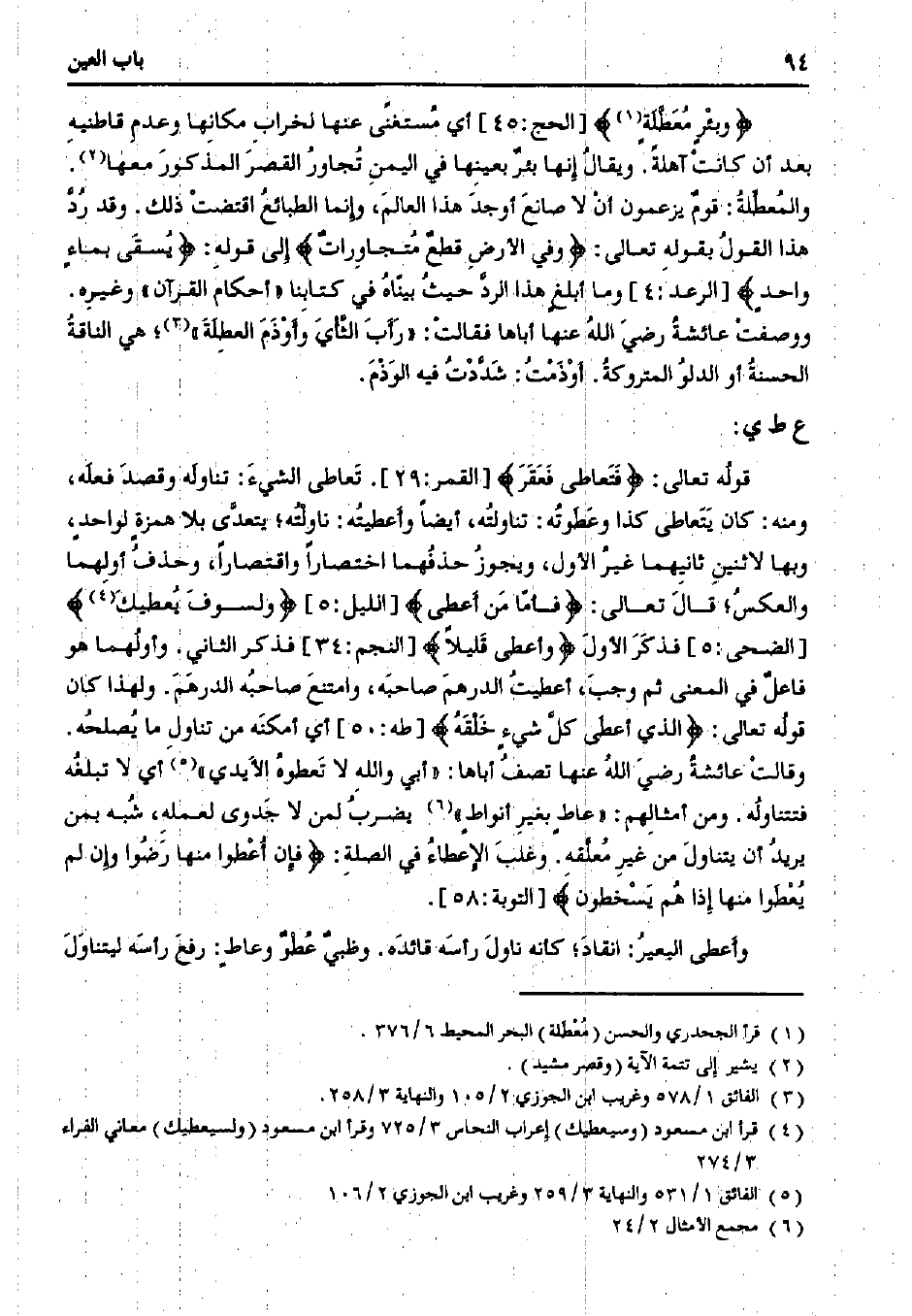 قوله تعالى:} فتعاطى فعقر {[القمر: 29]. تعاطى الشيء: تناوله وقصد فعله، ومنه: كان يتعاطى كذا وعطوته: تناولته، أيضًا وأعطيته: ناولته؛ يتعدى بلا همزةٍ لواحدٍ، وبها لاثنين ثانيهما غير الأول، ويجوز حذفهما اختصارًا واقتصارًا، وحذف أولهما والعكس؛ قال تعالى:} فأما من أعطى {[الليل: 5]} ولسوف يعطيك {[الضحى: 5] فذكر الأول} وأعطى قليلاً [[النجم: 34] فذكر الثاني. وأولهما هو فاعل في المعنى ثم وجب، أعطيت الدرهم صاحبه، وامتنع صاحبه الدرهم. ولهذا كان قوله تعالى:} الذي أعطى كل شيءٍ خلقه {[طه: 50] أي أمكنه من تناول ما يصلحه. وقالت عائشة رضي الله عنها تصف أباها: "أبي والله لا تعطوه الأيدي" أي لا تبلغه فتتناوله. ومن أمثالهم: "عاطٍ بغير أنواطٍ" يضرب لمن لا جدوى لعمله، شبه بمن يريد أن يتناول من غير معلقه. وغلب الإعطاء في الصلة:} فإن أعطوا منها رضوا وإن لم يعطوا منها إذا هم يسخطون {[التوبة: 58].