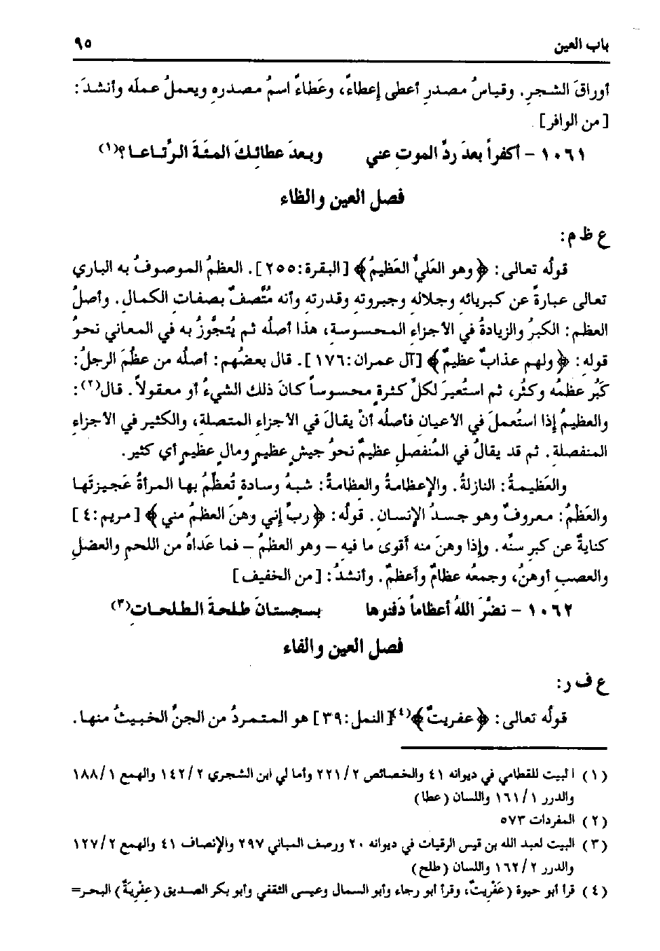 قوله تعالى:} وهو العلي العظيم {[البقرة: 255]. العظم الموصوف به الباري تعالى عبارًة عن كبريائه وجلاله وجبروته وقدرته وأنه متصف بصفات الكمال. وأصل العظم. الكبر والزيادة في الأجزاء المحسوسة، هذا أصله ثم يتجوز به في المعاني نحو قوله:} ولهم عذاب عظيم {[آل عمران: 176]. قال بعضهم: أصله من عظم الرجل: كبر عظمه وكثر، ثم استعير لكل كثرةٍ محسوسًا كان ذلك الشيء أو معقولاً. قال: والعظيم إذا استعمل في الأعيان فأصله أن يقال في الأجزاء المتصلة، والكثير في الأجزاء المنفصلة. ثم قد يقال في المنفصل عظيم نحو جيشٍ عظيمٍ ومالٍ عظيمٍ أي كثير.