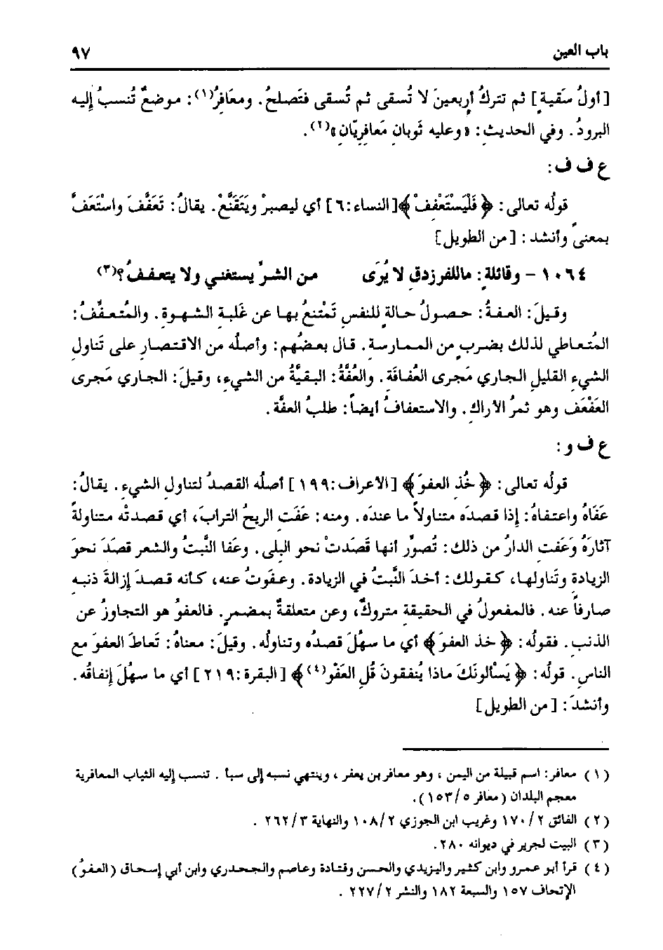 قوله تعالى:} خذ العفو [[الأعراف: 199] أصله القصد لتناول الشيء. يقال: عفاه واعتفاه: إذا قصده متناولاً ما عنده. ومنه: عفت الريح التراب، أي قصدته متناولًة آثاره وعفت الدار من ذلك: تصور أنها قصدت نحو البلى. وعفا النبت والشعر قصد نحو الزيادة وتناولها، كقولك: أخد النبت في الزيادة. وعفوت عنه، كأنه قصد إزالة ذنبه صارفًا عنه. فالمفعول في الحقيقة متروك، وعن متعلقة بمضمرٍ. فالعفو هو التجاوز عن الذنب. فقوله:} خذ العفو {أي ما سهل قصده وتناوله. وقيل: معناه: تعاط العفو مع الناس. قوله:} يسألونك ماذا ينفقون قل العفو {[البقرة: 219] أي ما سهل إنفاقه. وأنشد: [من الطويل]