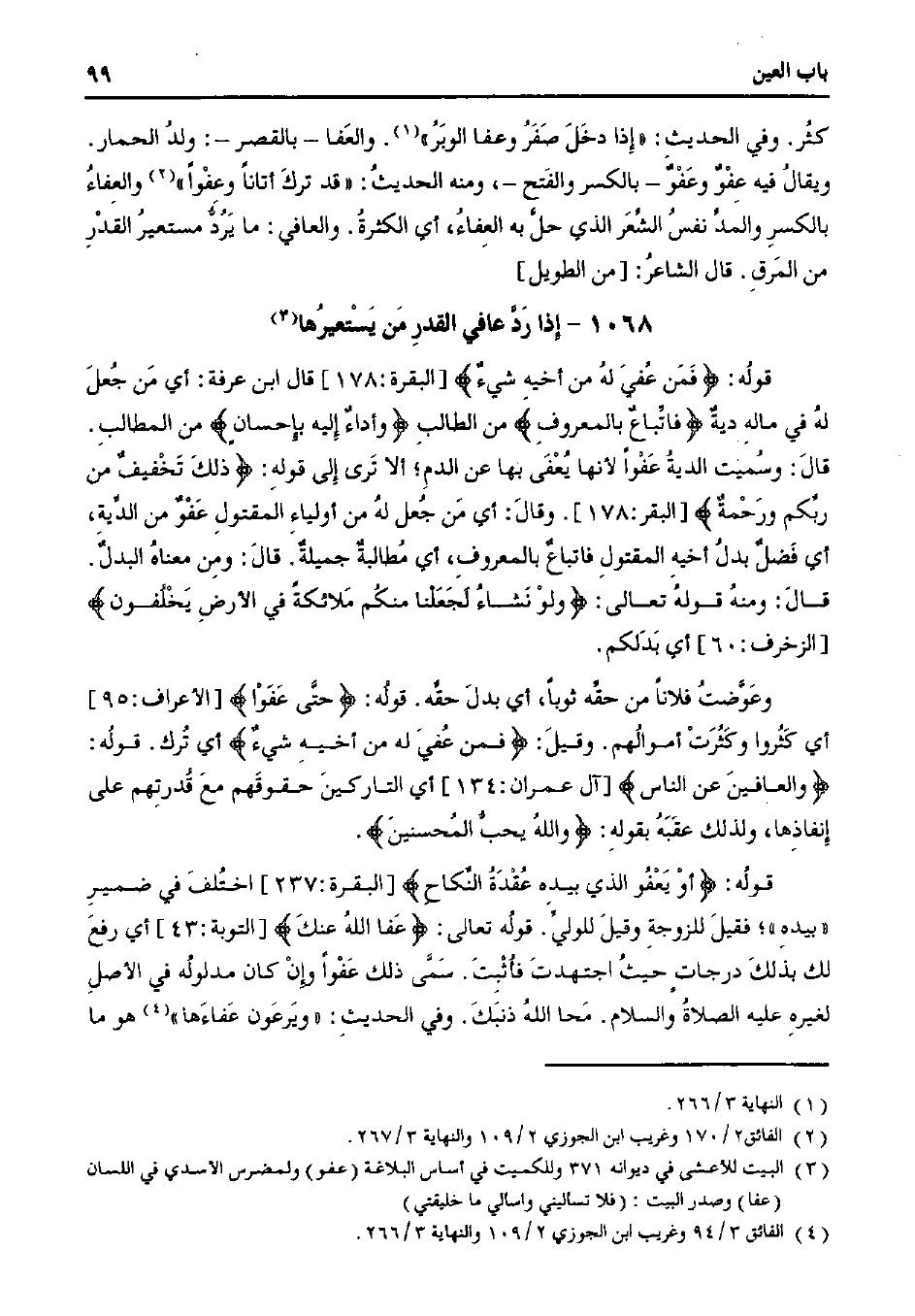 وعوضت فلانًا من حقه ثوبًا، أي بدل حقه. قوله:} حتى عفوا {[الأعراف: 95] أي كثروا وكثرت أموالهم. وقيل:} فمن عفي له من أخيه شيء {أي ترك. قوله:} والعافين عن الناس {[آل عمران: 134] أي التاركين حقوقهم مع قدرتهم على إنفاذها، ولذلك عقبه بقوله:} والله يحب المحسنين {.