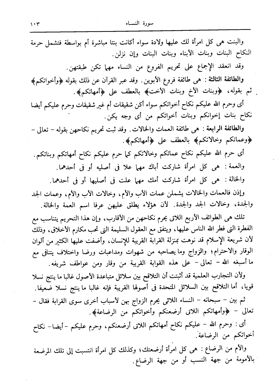 تلك هي الطوائف الأربع اللاتي يحرم نكاحهن من الأقارب، وإن هذا التحريم يتناسب مع الفطرة التي فطر الله الناس عليها، ويتفق مع العقول السليمة التي تحب مكارم الأخلاق، وذلك لأن شريعة الإسلام قد نوهت بمنزلة القرابة القريبة للإنسان، وأضفت عليها الكثير من ألوان الوقار والاحترام والزواج وما يصاحبه من شهوات ومداعبات ورضا واختلاف يتنافى مع ما أسبغه الله- تعالى- على هذه القرابة القريبة من وقار ومن عواطف شريفه.