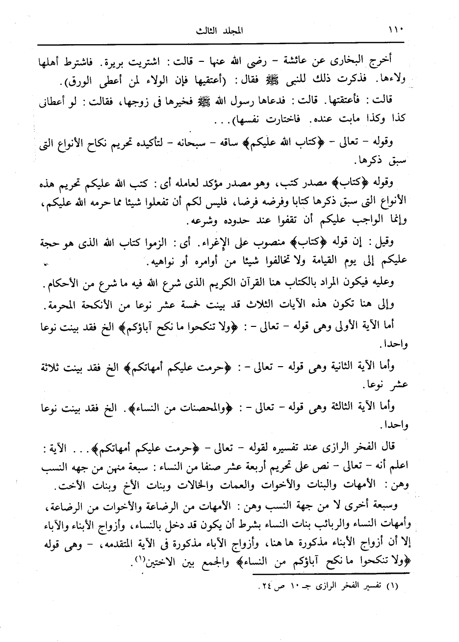قال الفخر الرازي عند تفسيره لقوله- تعالى- حُرِّمَتْ عَلَيْكُمْ أُمَّهاتُكُمْ ... الآية: