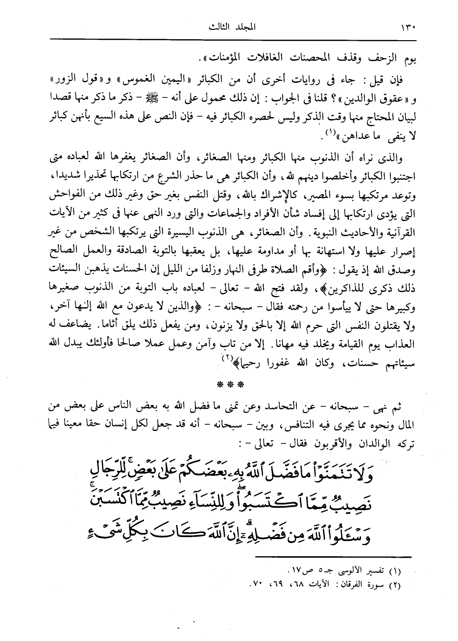 والذي نراه أن الذنوب منها الكبائر ومنها الصغائر، وأن الصغائر يغفرها الله لعباده متى اجتنبوا الكبائر وأخلصوا دينهم لله، وأن الكبائر هي ما حذر الشرع من ارتكابها تحذيرا شديدا، وتوعد مرتكبها بسوء المصير، كالإشراك بالله، وقتل النفس بغير حق وغير ذلك من الفواحش التي يؤدى ارتكابها إلى إفساد شأن الأفراد والجماعات والتي ورد النهى عنها في كثير من الآيات القرآنية والأحاديث النبوية. وأن الصغائر، هي الذنوب اليسيرة التي يرتكبها الشخص من غير إصرار عليها ولا استهانة بها أو مداومة عليها، بل يعقبها بالتوبة الصادقة والعمل الصالح وصدق الله إذ يقول: وَأَقِمِ الصَّلاةَ طَرَفَيِ النَّهارِ وَزُلَفاً مِنَ اللَّيْلِ إِنَّ الْحَسَناتِ يُذْهِبْنَ السَّيِّئاتِ ذلِكَ ذِكْرى لِلذَّاكِرِينَ، ولقد فتح الله- تعالى- لعباده باب التوبة من الذنوب صغيرها وكبيرها حتى لا ييأسوا من رحمته فقال- سبحانه-: وَالَّذِينَ لا يَدْعُونَ مَعَ اللَّهِ إِلهاً آخَرَ، وَلا يَقْتُلُونَ النَّفْسَ الَّتِي حَرَّمَ اللَّهُ إِلَّا بِالْحَقِّ وَلا يَزْنُونَ، وَمَنْ يَفْعَلْ ذلِكَ يَلْقَ أَثاماً. يُضاعَفْ لَهُ الْعَذابُ يَوْمَ الْقِيامَةِ وَيَخْلُدْ فِيهِ مُهاناً. إِلَّا مَنْ تابَ وَآمَنَ وَعَمِلَ عَمَلًا صالِحاً فَأُوْلئِكَ يُبَدِّلُ اللَّهُ سَيِّئاتِهِمْ حَسَناتٍ، وَكانَ اللَّهُ غَفُوراً رَحِيماً «2» ثم نهى- سبحانه- عن التحاسد وعن تمنى ما فضل الله به بعض الناس على بعض من المال ونحوه مما يجرى فيه التنافس، وبين- سبحانه- أنه قد جعل لكل إنسان حقا معينا فيما تركه الوالدان والأقربون فقال- تعالى-: