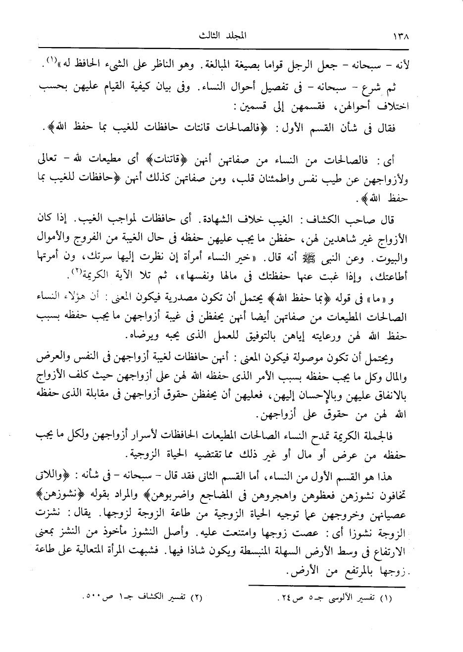 فقال في شأن القسم الأول: فَالصَّالِحاتُ قانِتاتٌ حافِظاتٌ لِلْغَيْبِ بِما حَفِظَ اللَّهُ.
