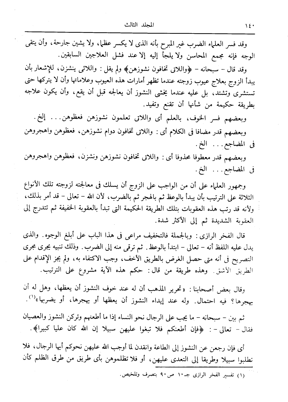 وجمهور العلماء على أن من الواجب على الزوج أن يسلك في معالجته لزوجته تلك الأنواع الثلاثة على الترتيب بأن يبدأ بالوعظ ثم بالهجر ثم بالضرب، لأن الله- تعالى- قد أمر بذلك، ولأنه قد رتب هذه العقوبات بتلك الطريقة الحكيمة التي تبدأ بالعقوبة الخفيفة ثم تتدرج إلى العقوبة الشديدة ثم إلى الأكثر شدة.