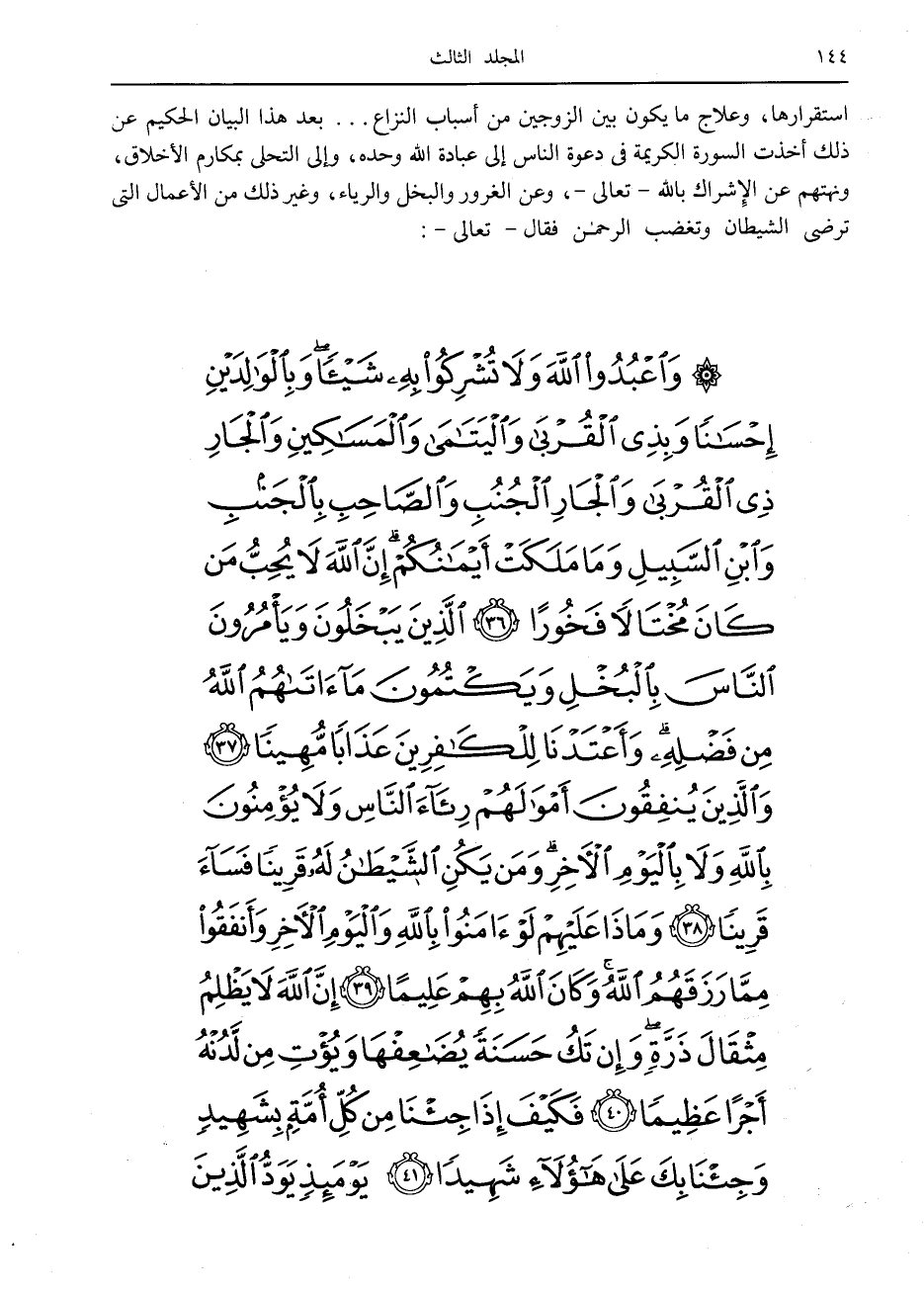 وَاعْبُدُوا اللَّهَ وَلا تُشْرِكُوا بِهِ شَيْئاً وَبِالْوالِدَيْنِ إِحْساناً وَبِذِي الْقُرْبى وَالْيَتامى وَالْمَساكِينِ وَالْجارِ ذِي الْقُرْبى وَالْجارِ الْجُنُبِ وَالصَّاحِبِ بِالْجَنْبِ وَابْنِ السَّبِيلِ وَما مَلَكَتْ أَيْمانُكُمْ إِنَّ اللَّهَ لا يُحِبُّ مَنْ كانَ مُخْتالاً فَخُوراً (36) الَّذِينَ يَبْخَلُونَ وَيَأْمُرُونَ النَّاسَ بِالْبُخْلِ وَيَكْتُمُونَ ما آتاهُمُ اللَّهُ مِنْ فَضْلِهِ وَأَعْتَدْنا لِلْكافِرِينَ عَذاباً مُهِيناً (37) وَالَّذِينَ يُنْفِقُونَ أَمْوالَهُمْ رِئاءَ النَّاسِ وَلا يُؤْمِنُونَ بِاللَّهِ وَلا بِالْيَوْمِ الْآخِرِ وَمَنْ يَكُنِ الشَّيْطانُ لَهُ قَرِيناً فَساءَ قَرِيناً (38) وَماذا عَلَيْهِمْ لَوْ آمَنُوا بِاللَّهِ وَالْيَوْمِ الْآخِرِ وَأَنْفَقُوا مِمَّا رَزَقَهُمُ اللَّهُ وَكانَ اللَّهُ بِهِمْ عَلِيماً (39) إِنَّ اللَّهَ لا يَظْلِمُ مِثْقالَ ذَرَّةٍ وَإِنْ تَكُ حَسَنَةً يُضاعِفْها وَيُؤْتِ مِنْ لَدُنْهُ أَجْراً عَظِيماً (40)