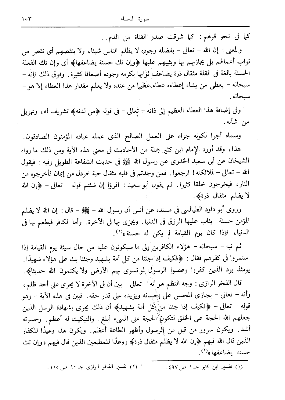 هذا، وقد أورد الإمام ابن كثير جملة من الأحاديث في معنى هذه الآية ومن ذلك ما رواه الشيخان عن أبى سعيد الخدري عن رسول الله صلى الله عليه وسلم في حديث الشفاعة الطويل وفيه: فيقول الله- تعالى- لملائكته! ارجعوا. فمن وجدتم في قلبه مثقال حبة خردل من إيمان فأخرجوه من النار، فيخرجون خلقا كثيرا. ثم يقول أبو سعيد: اقرؤا إن شئتم قوله- تعالى- إِنَّ اللَّهَ لا يَظْلِمُ مِثْقالَ ذَرَّةٍ.