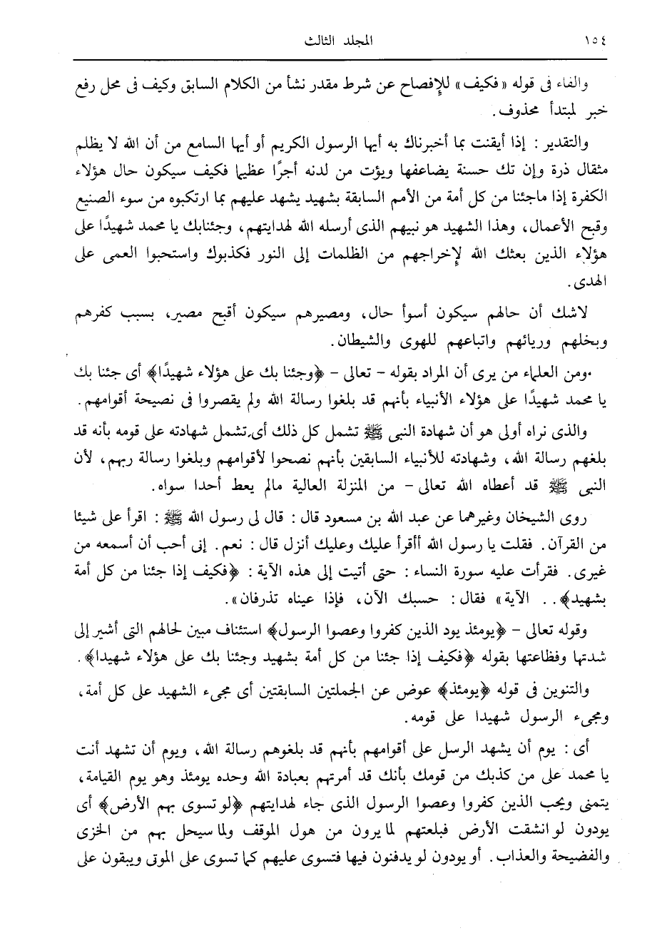 والتقدير: إذا أيقنت بما أخبرناك به أيها الرسول الكريم أو أيها السامع من أن الله لا يظلم مثقال ذرة وإن تك حسنة يضاعفها ويؤت من لدنه أجرا عظيما فكيف يكون حال هؤلاء الكفرة إذا ما جئنا من كل أمة من الأمم السابقة بشهيد يشهد عليهم بما ارتكبوه من سوء الصنيع وقبح الأعمال، وهذا الشهيد هو نبيهم الذي أرسله الله لهدايتهم، وجئنا بك يا محمد شهيدا على هؤلاء الذين بعثك الله لإخراجهم من الظلمات إلى النور فكذبوك واستحبوا العمى على الهدى.