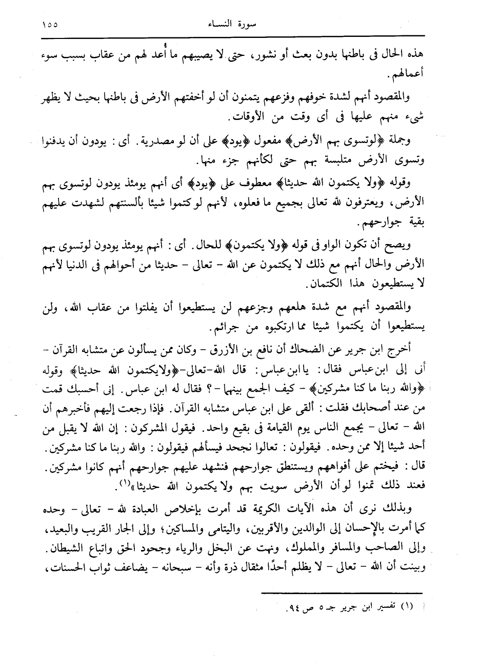 وقوله وَلا يَكْتُمُونَ اللَّهَ حَدِيثاً معطوف على يَوَدُّ أى أنهم يومئذ يودون لو تسوى بهم الأرض، ويعترفون لله تعالى بجميع ما فعلوه، لأنهم لو كتموا شيئا بألسنتهم لشهدت عليهم بقية جوارحهم.