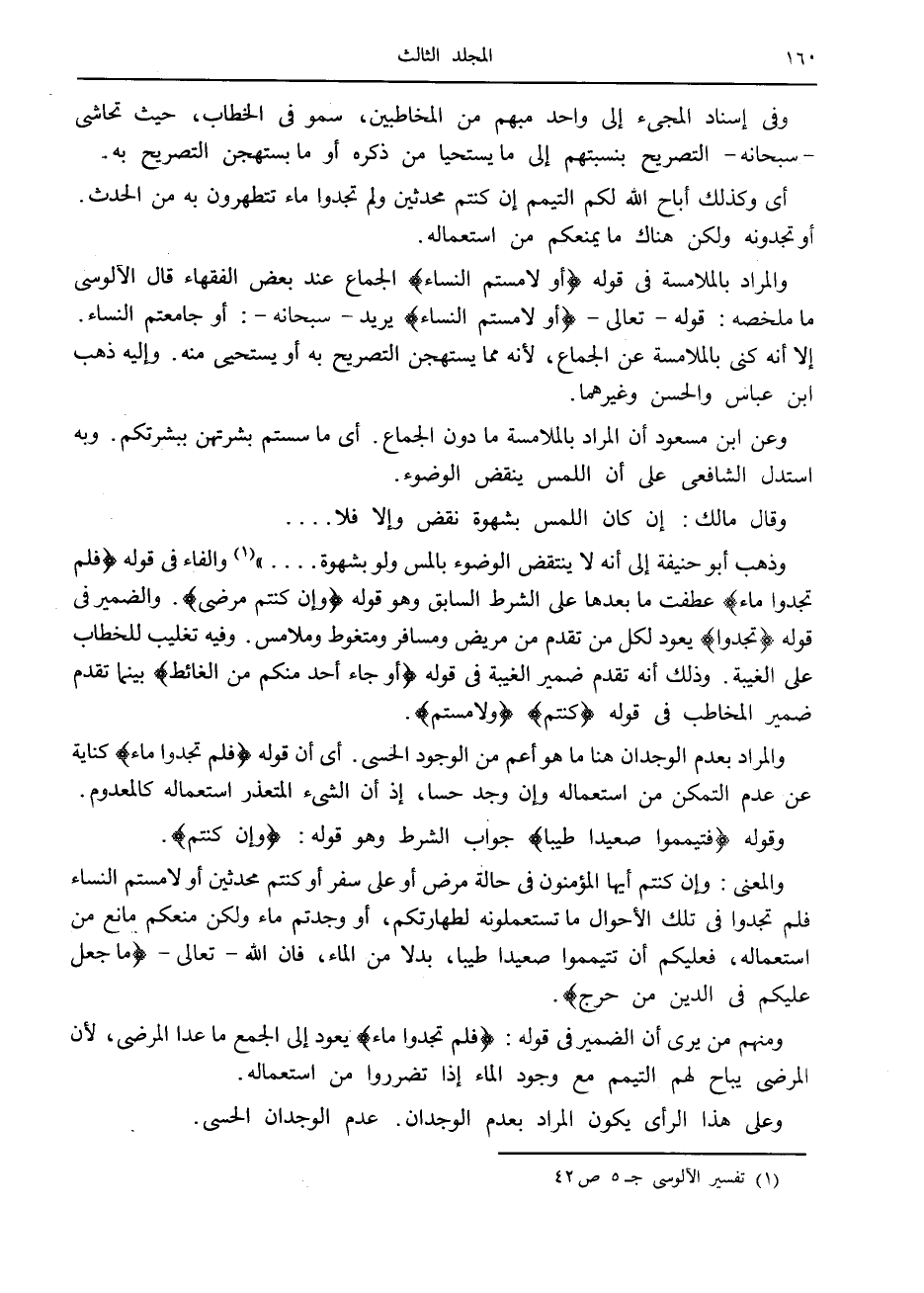 والمراد بالملامسة في قوله أَوْ لامَسْتُمُ النِّساءَ الجماع عند بعض الفقهاء قال الآلوسى ما ملخصه: قوله- تعالى- أَوْ لامَسْتُمُ النِّساءَ يريد- سبحانه-: أو جامعتم النساء.