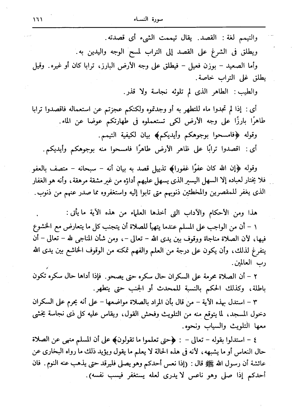 4- استدلوا بقوله- تعالى-: حَتَّى تَعْلَمُوا ما تَقُولُونَ على أن المسلم منهى عن الصلاة حال النعاس أو ما يشبهه، لأنه في هذه الحالة لا يعلم ما يقول ويؤيد ذلك ما رواه البخاري عن عائشة أن رسول الله صلى الله عليه وسلم قال: (إذا نعس أحدكم وهو يصلى فليرقد حتى يذهب عنه النوم. فان أحدكم إذا صلى وهو ناعس لا يدرى لعله يستغفر فيسب نفسه) .