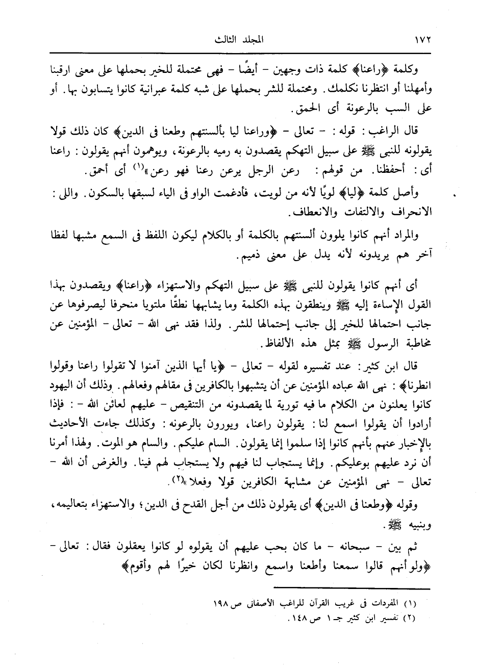 وكلمة راعِنا كلمة ذات وجهين- أيضا- فهي محتملة للخير بحملها على معنى ارقبنا وأمهلنا أو انتظرنا نكلمك. ومحتملة للشر بحملها على شبه كلمة عبرانية كانوا يتسابون بها. أو على السب بالرعونة أى الحمق.